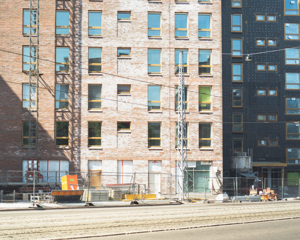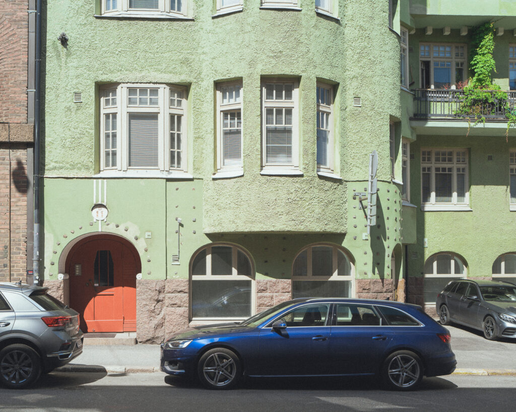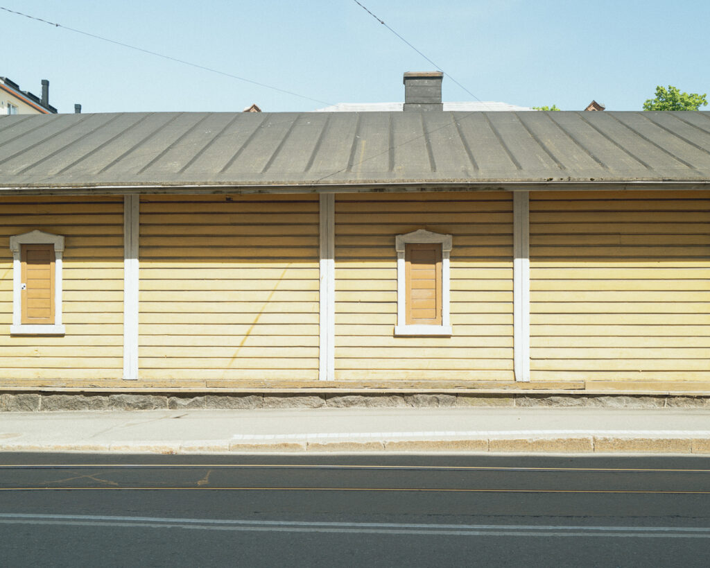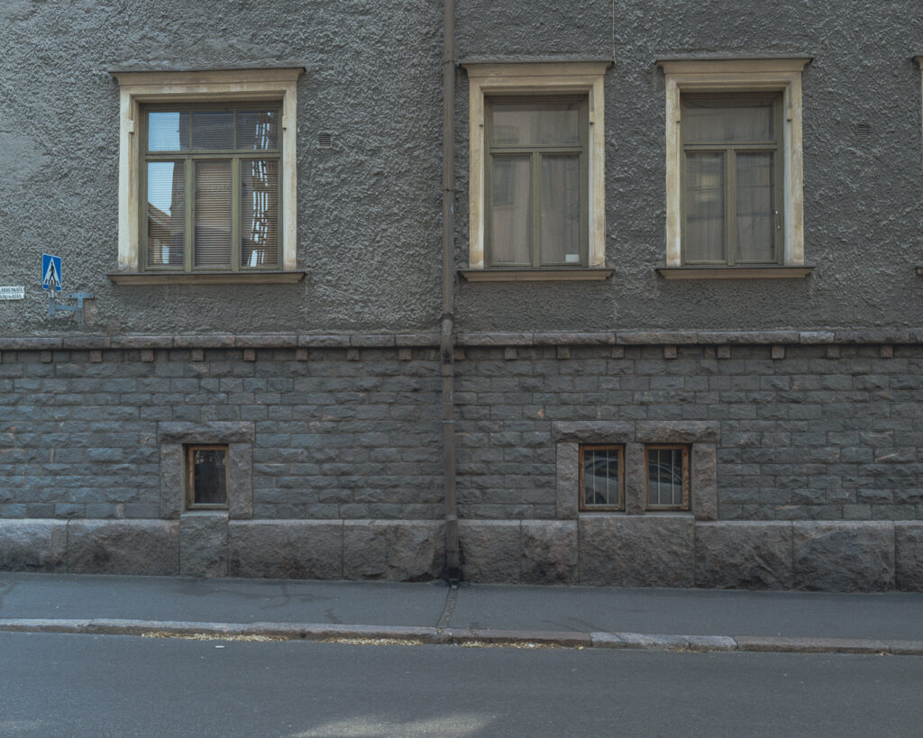 ヘルシンキの西側にある水辺の地区の壁と窓。この地区は、中心部と違って新しい建物が多く、どれも似たような雰囲気をしています。軒がなく、全体的にすっきりとしているところも特徴的。