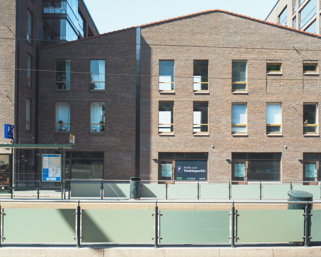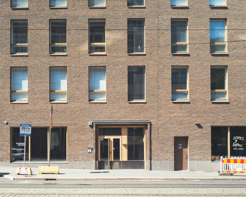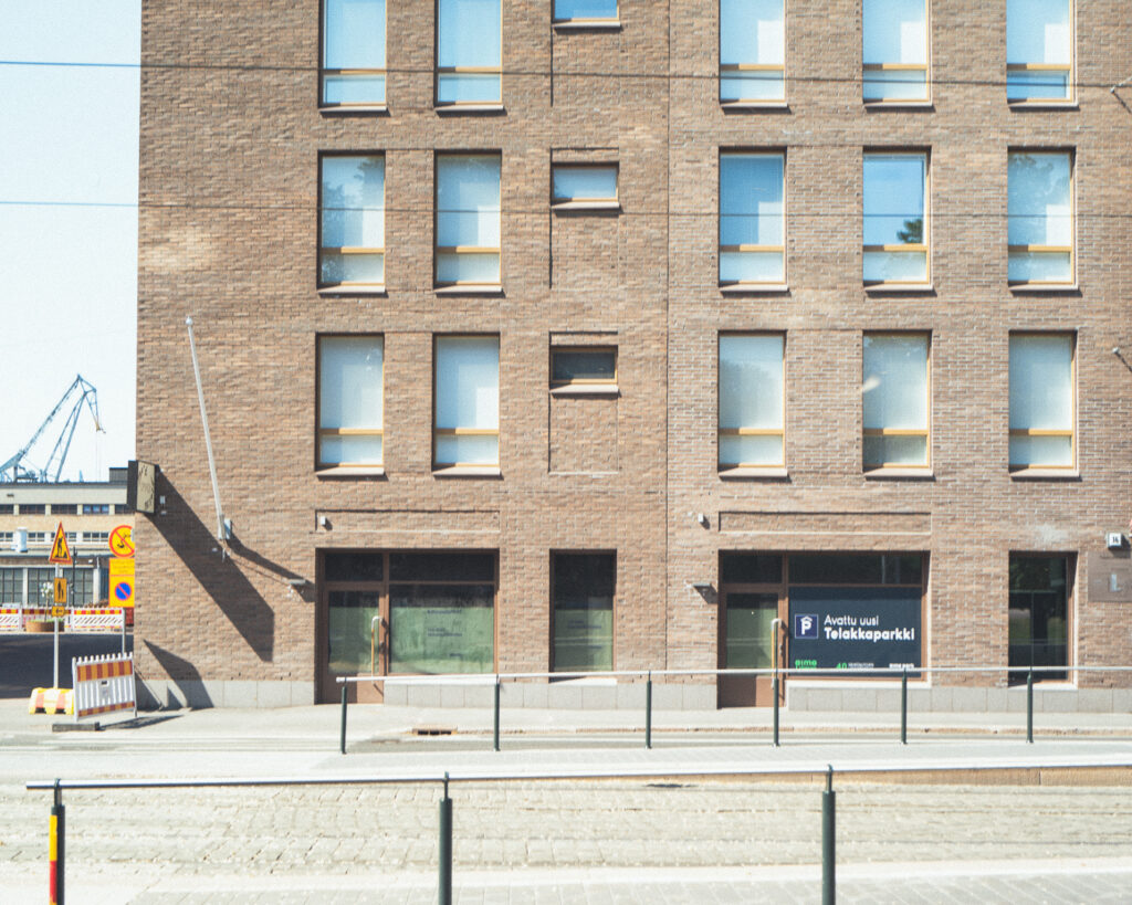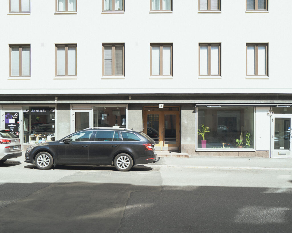 ヘルシンキの西側にある水辺の地区の壁と窓。この地区は、中心部と違って新しい建物が多く、どれも似たような雰囲気をしています。軒がなく、全体的にすっきりとしているところも特徴的。