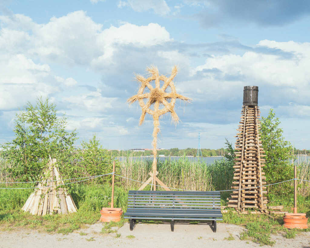 海辺に立つのはボンファイヤーの木組みです。大きな火が上がるボンファイヤーは夏至祭の目玉イベントのひとつですが、今年は乾燥・風の影響(火災への懸念)から中止に。三つの木組みは寂しそうに佇んでいました。