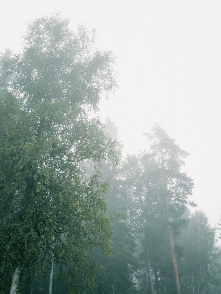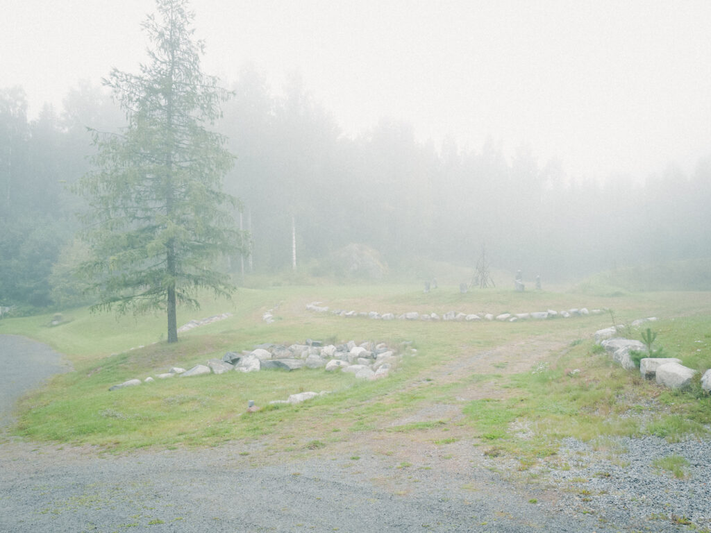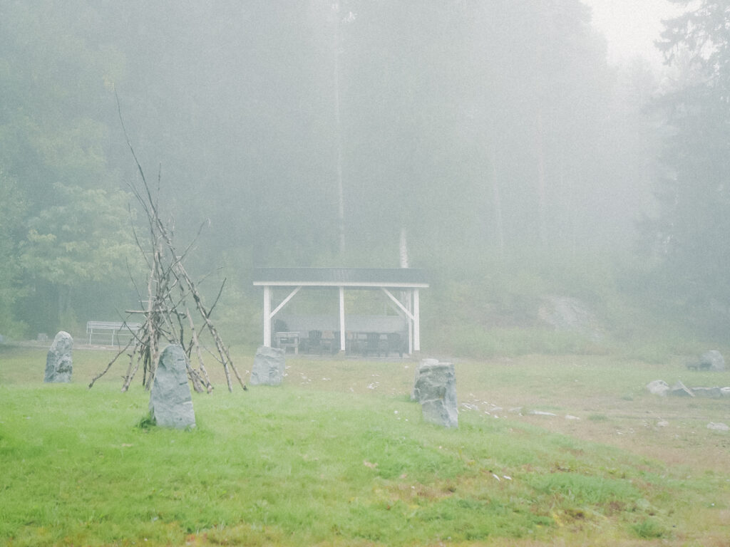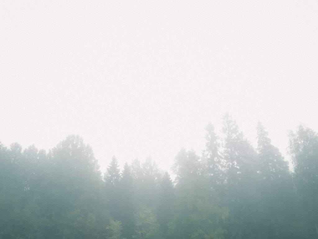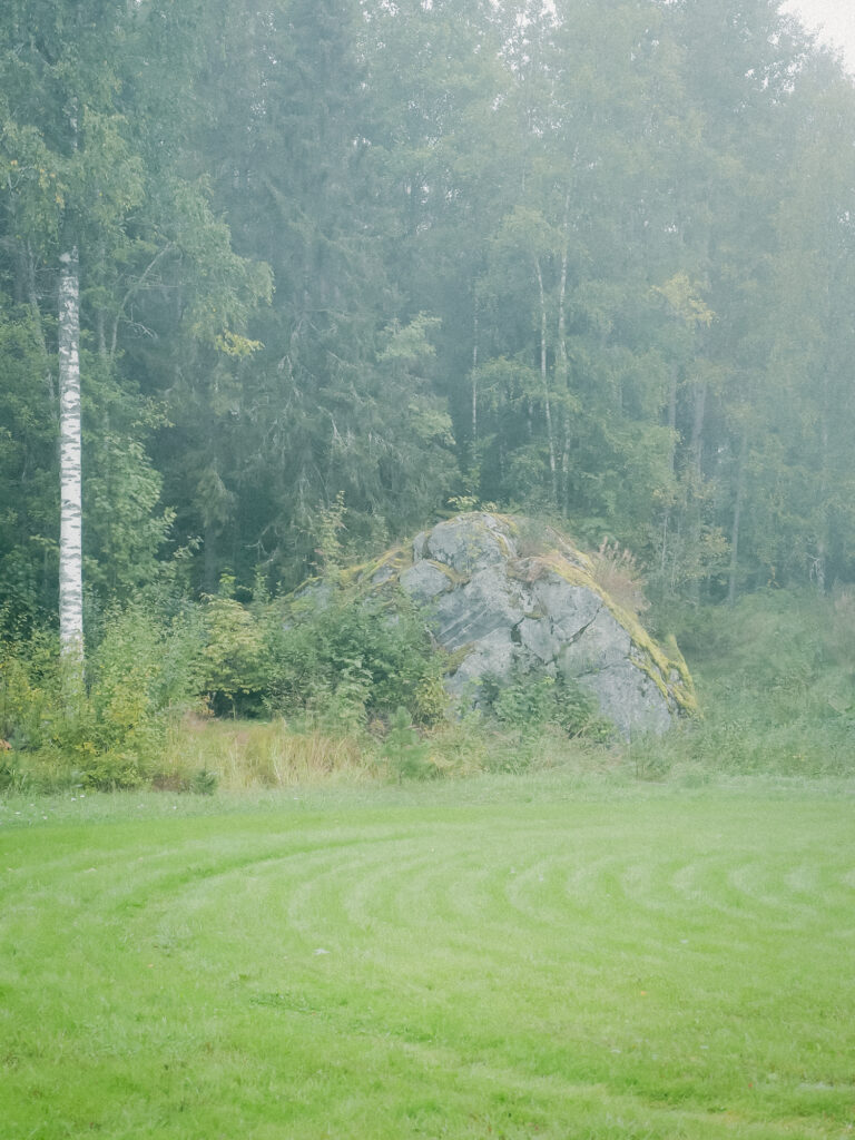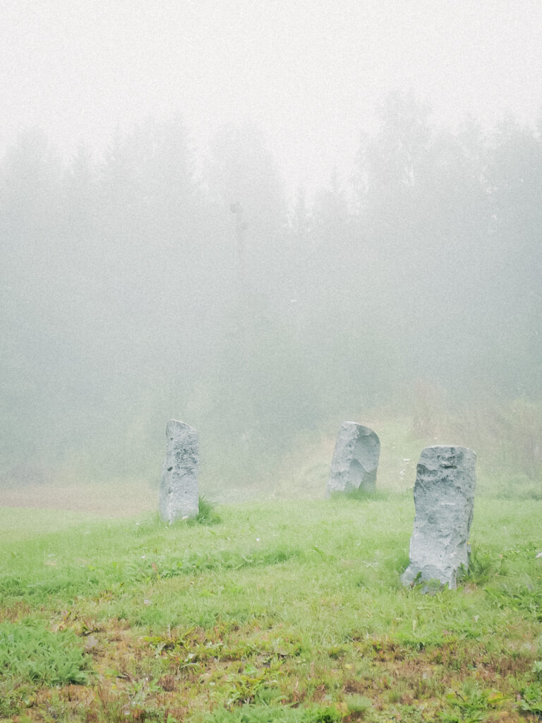 霧に溶ける森と、静かに佇む大きな石。