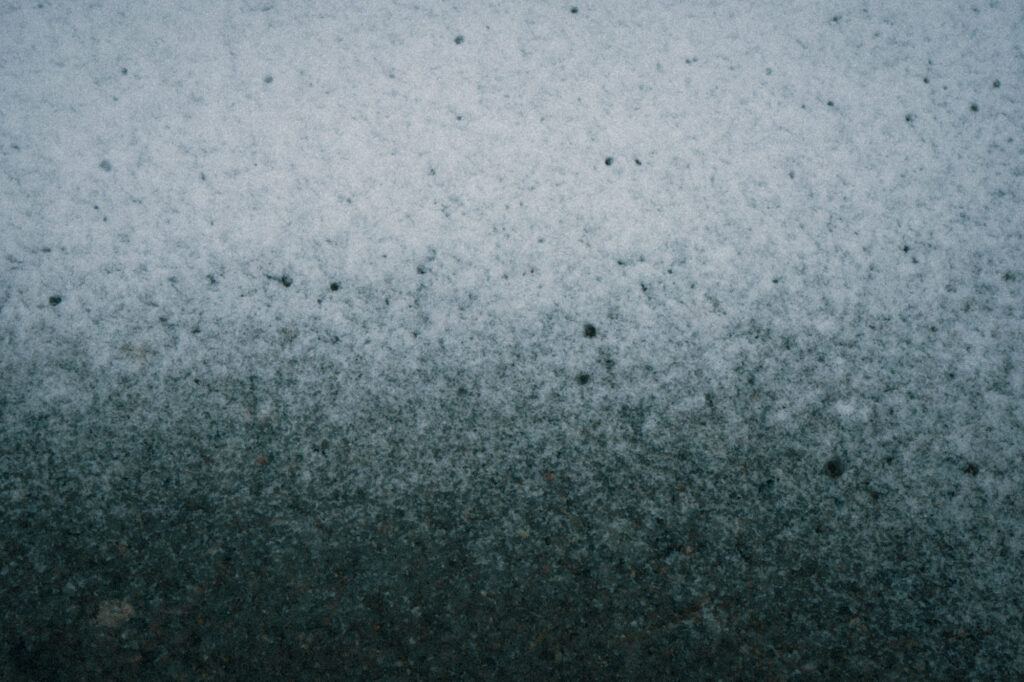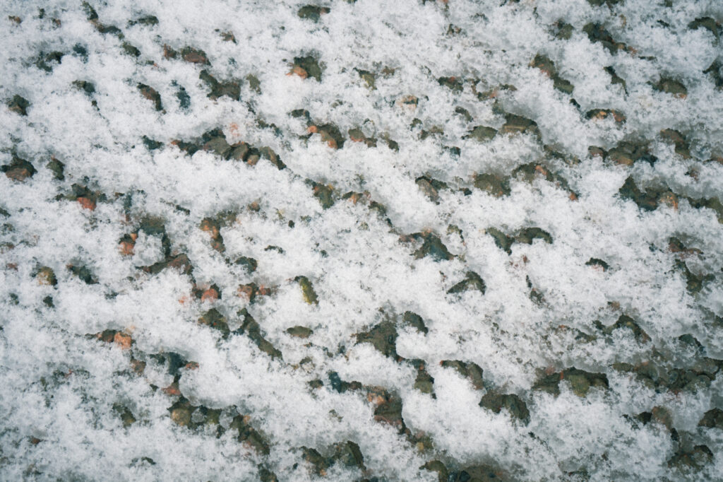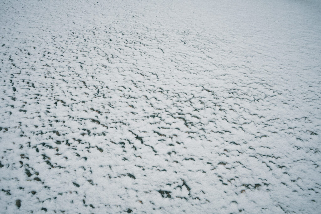 雪に雨粒が落ちて、無数の穴を開けています。