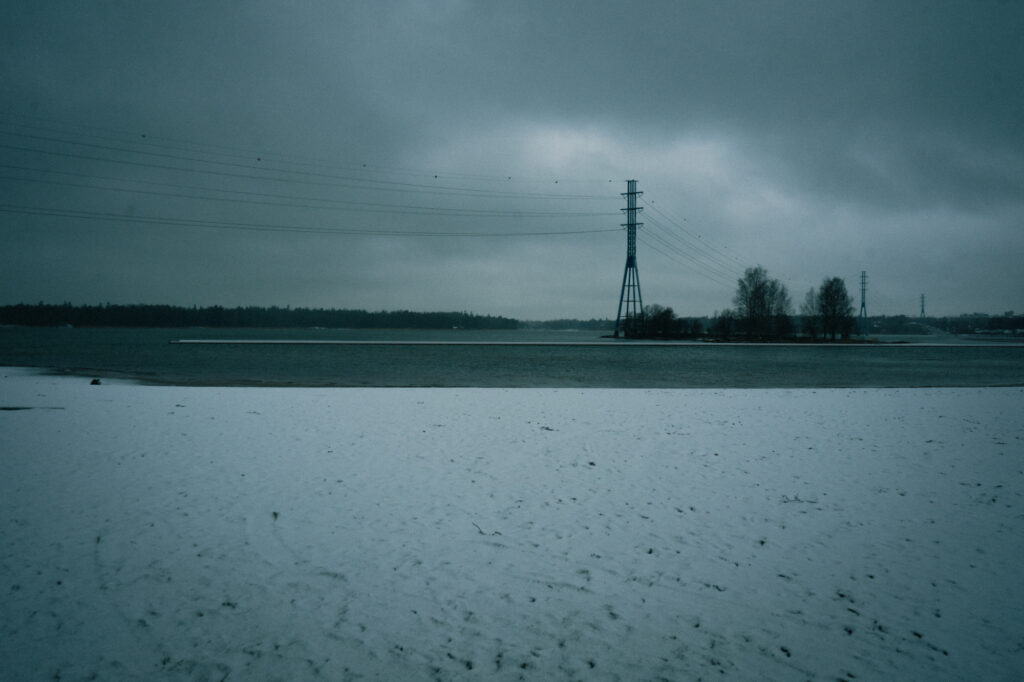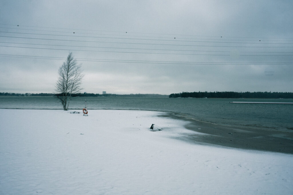 雪かみぞれか、あるいはその中間のようなものが海に飲み込まれてゆくのを眺めながら歩いていると、ヒエタニエミビーチに辿り着きました。夏は朝も晩も多くの人で賑わうこのビーチも、この日は大きな不在に包まれています。