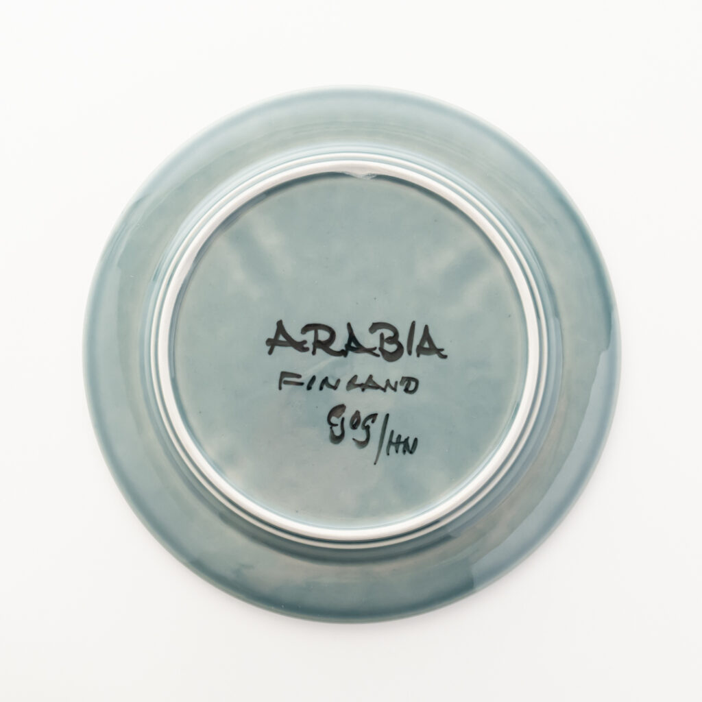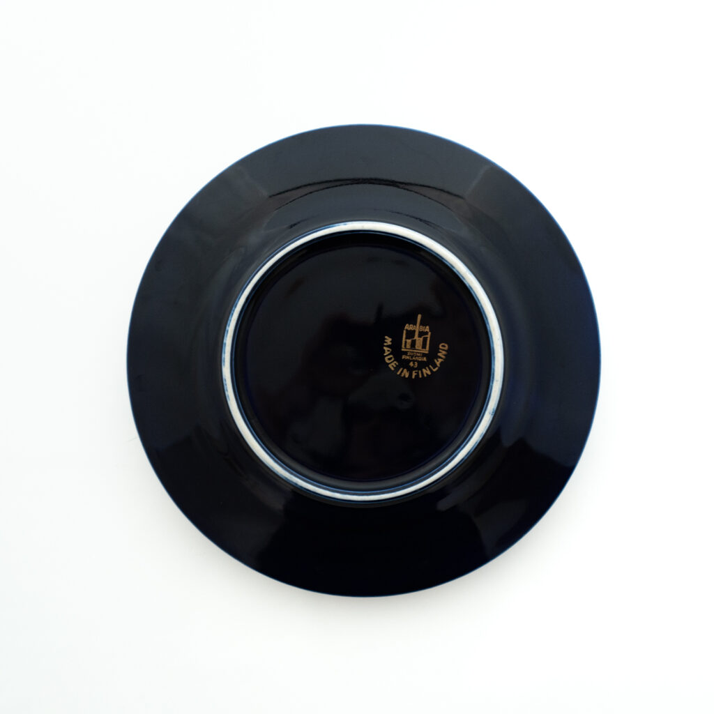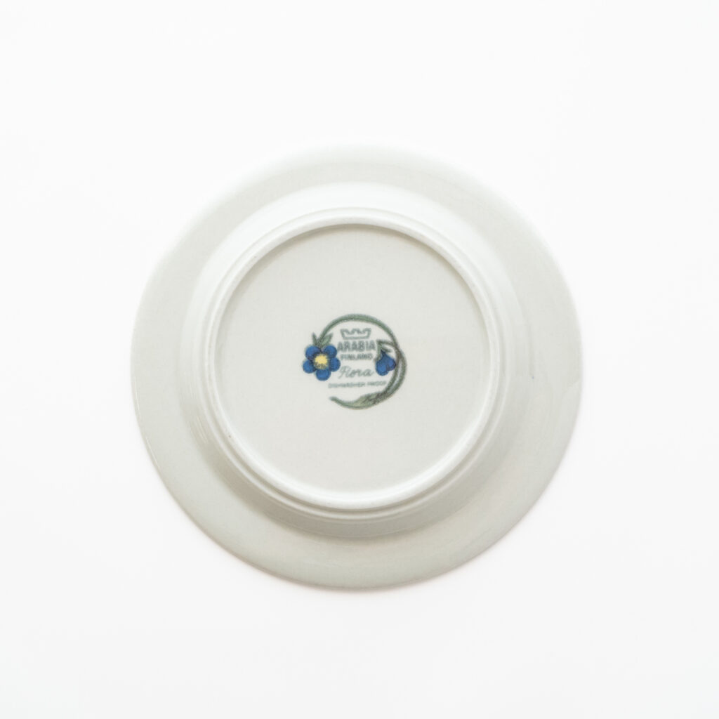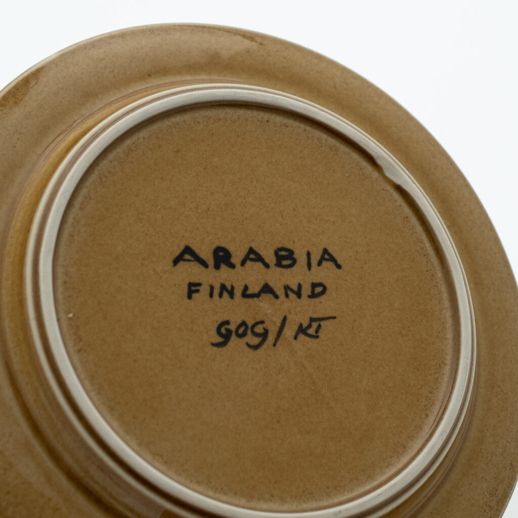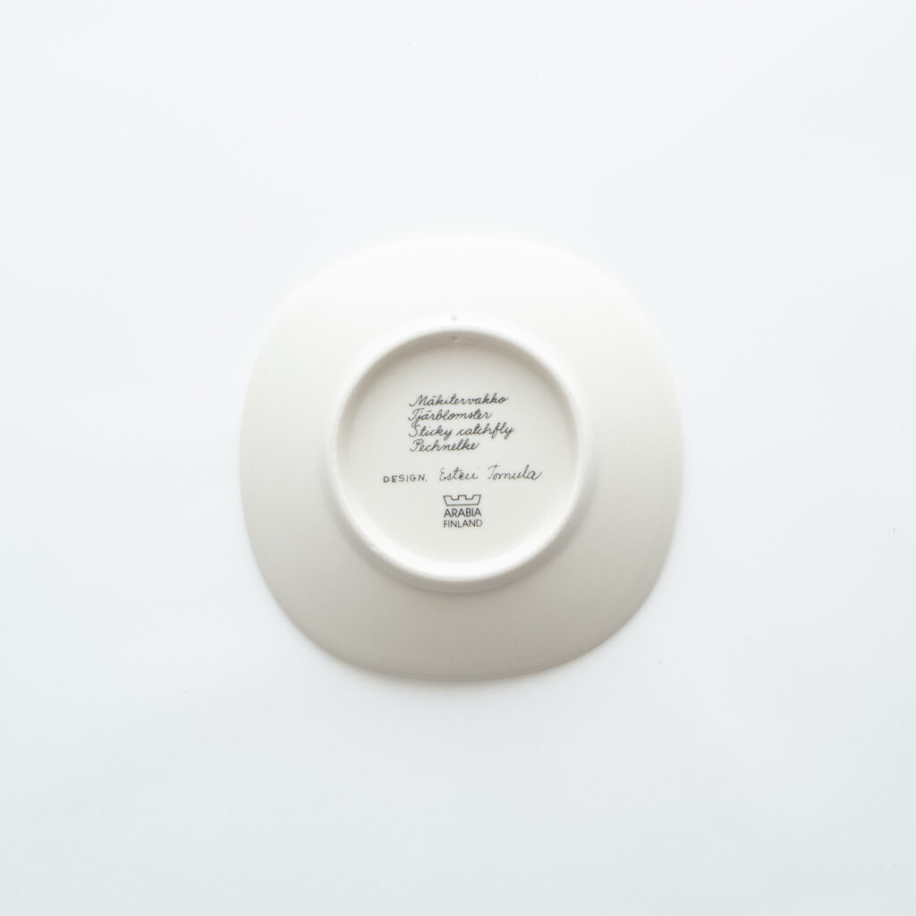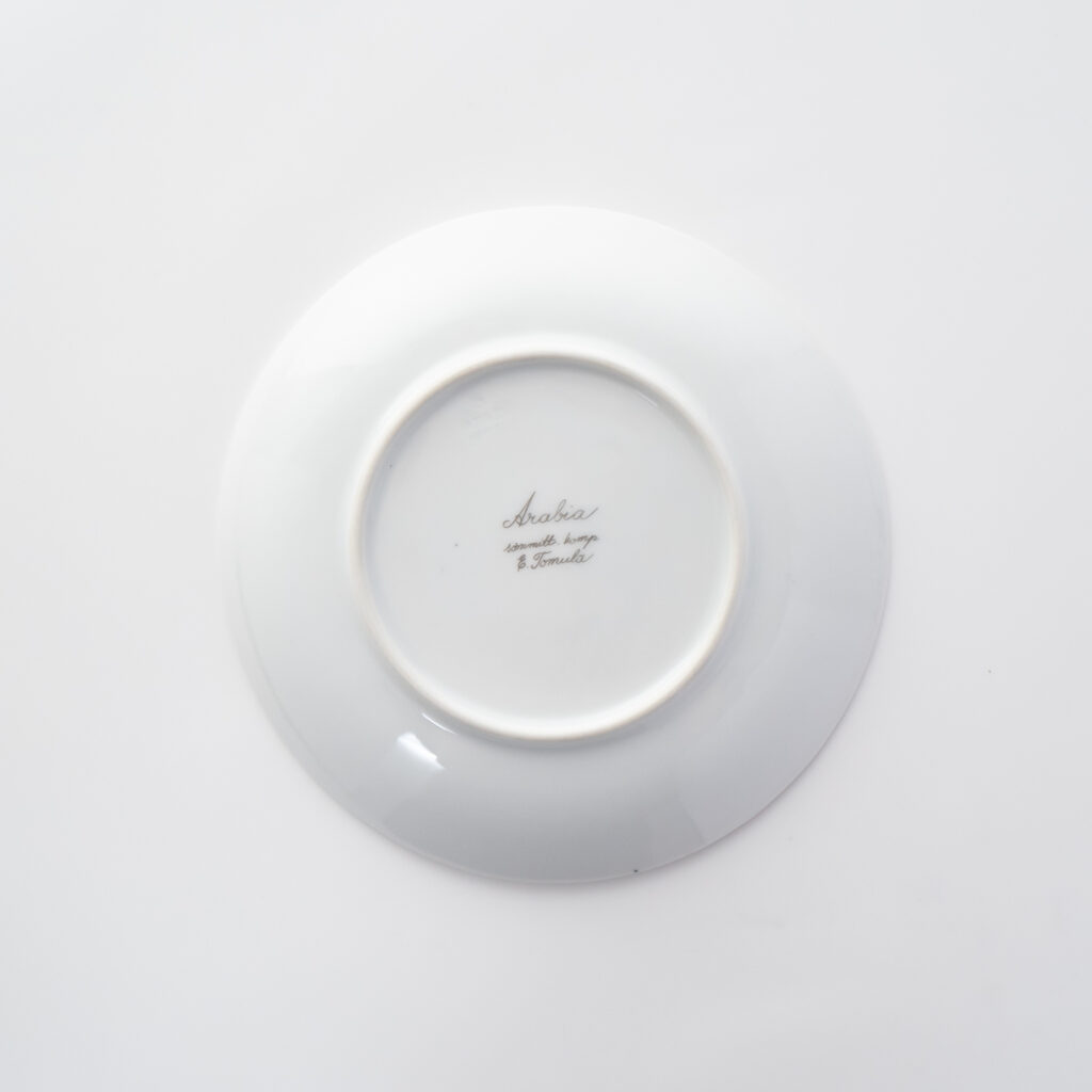 こちらのMonicaシリーズには、通常とは異なる筆記体デザインのスタンプが残されています。上には「Arabia」と、真ん中には「Somm. Komp. (それぞれ、フィンランド語とスウェーデン語でパターンデザインの意味)」と、下には「E. Tomula」と。