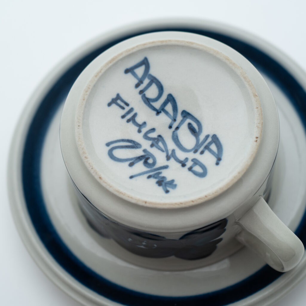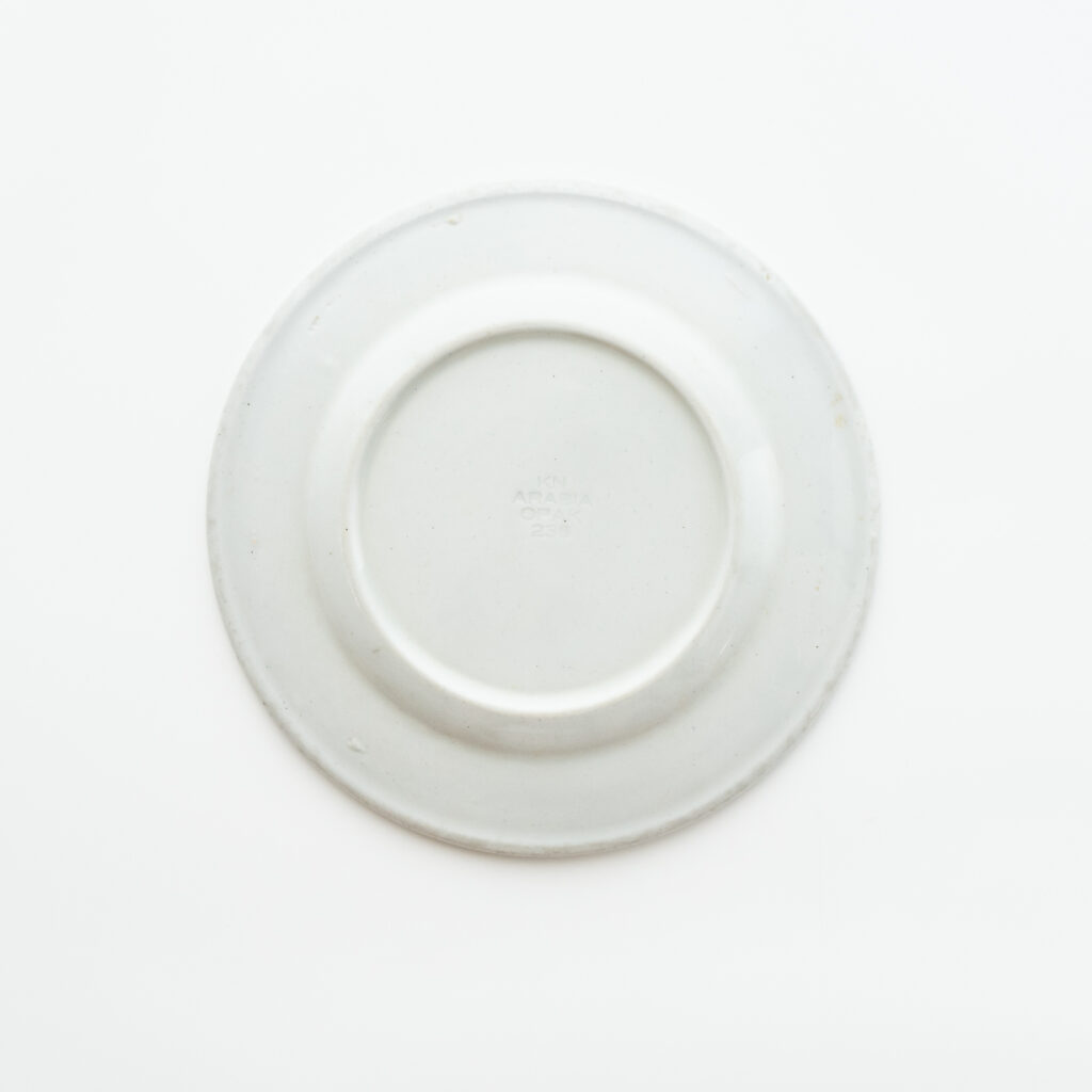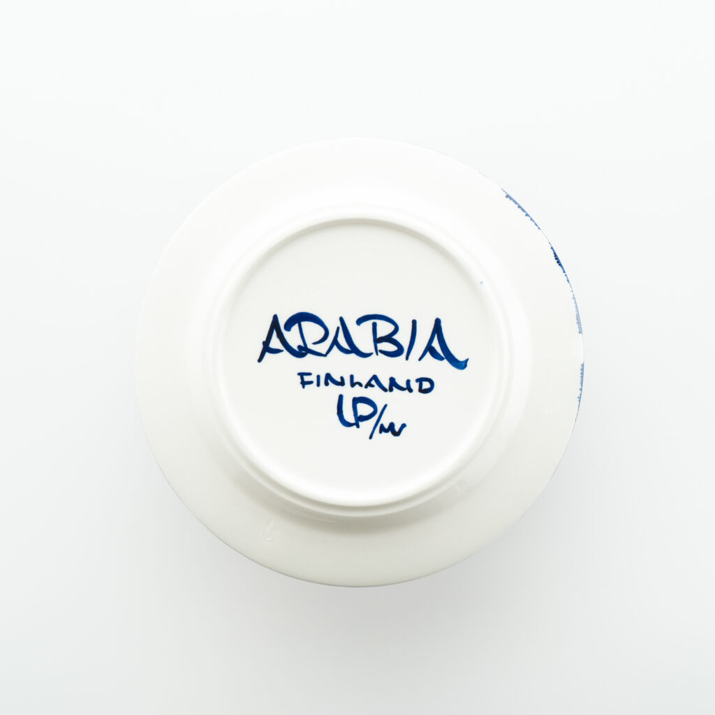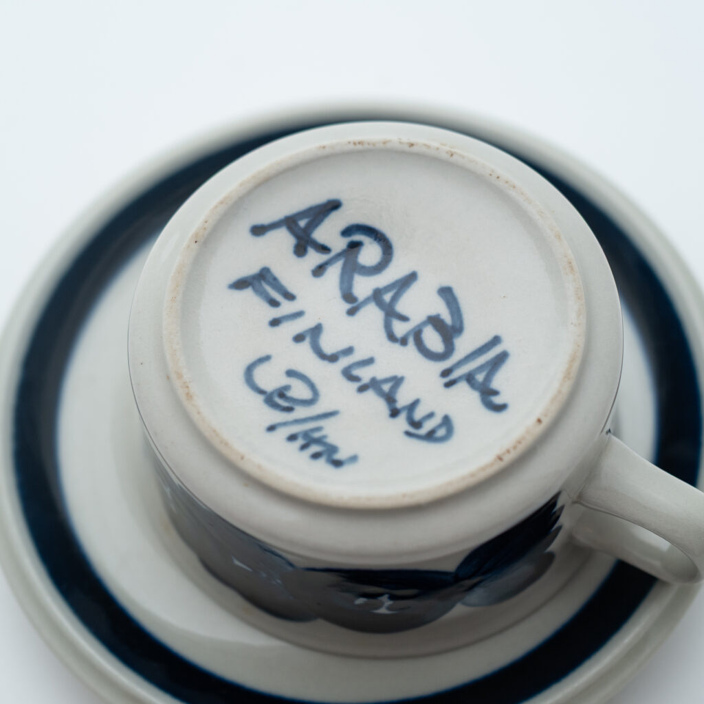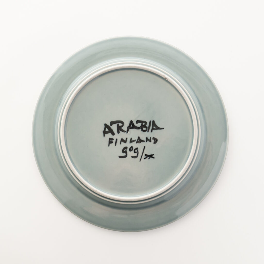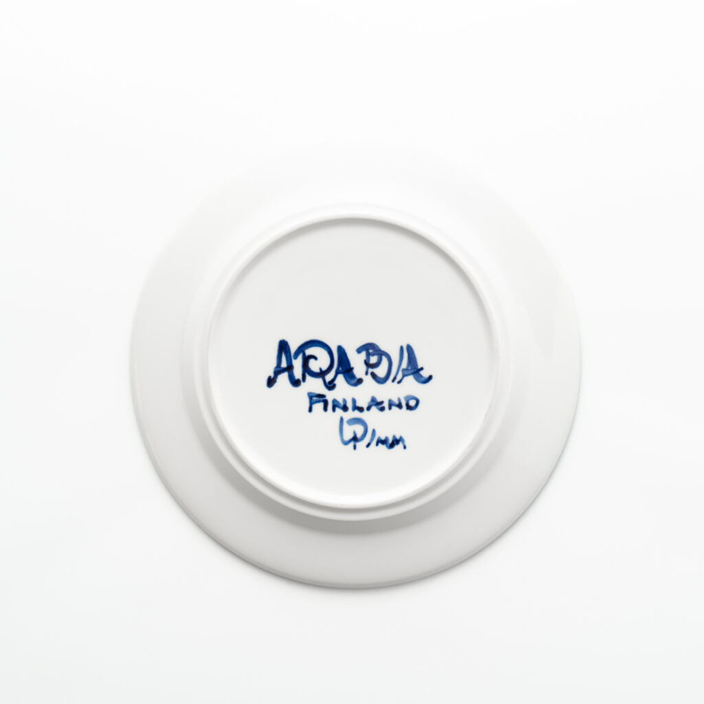 こちらのMonicaシリーズには、通常とは異なる筆記体デザインのスタンプが残されています。上には「Arabia」と、真ん中には「Somm. Komp. (それぞれ、フィンランド語とスウェーデン語でパターンデザインの意味)」と、下には「E. Tomula」と。