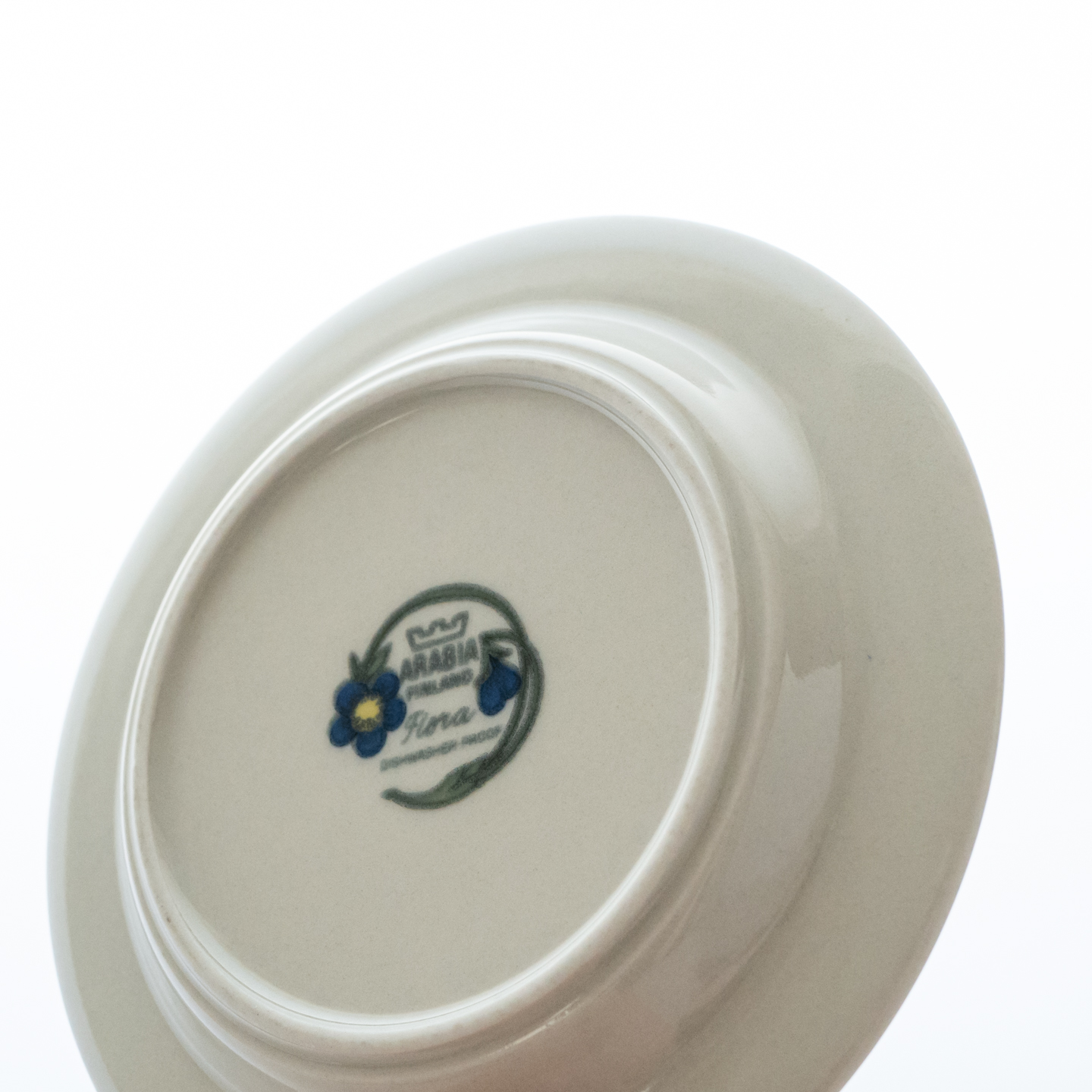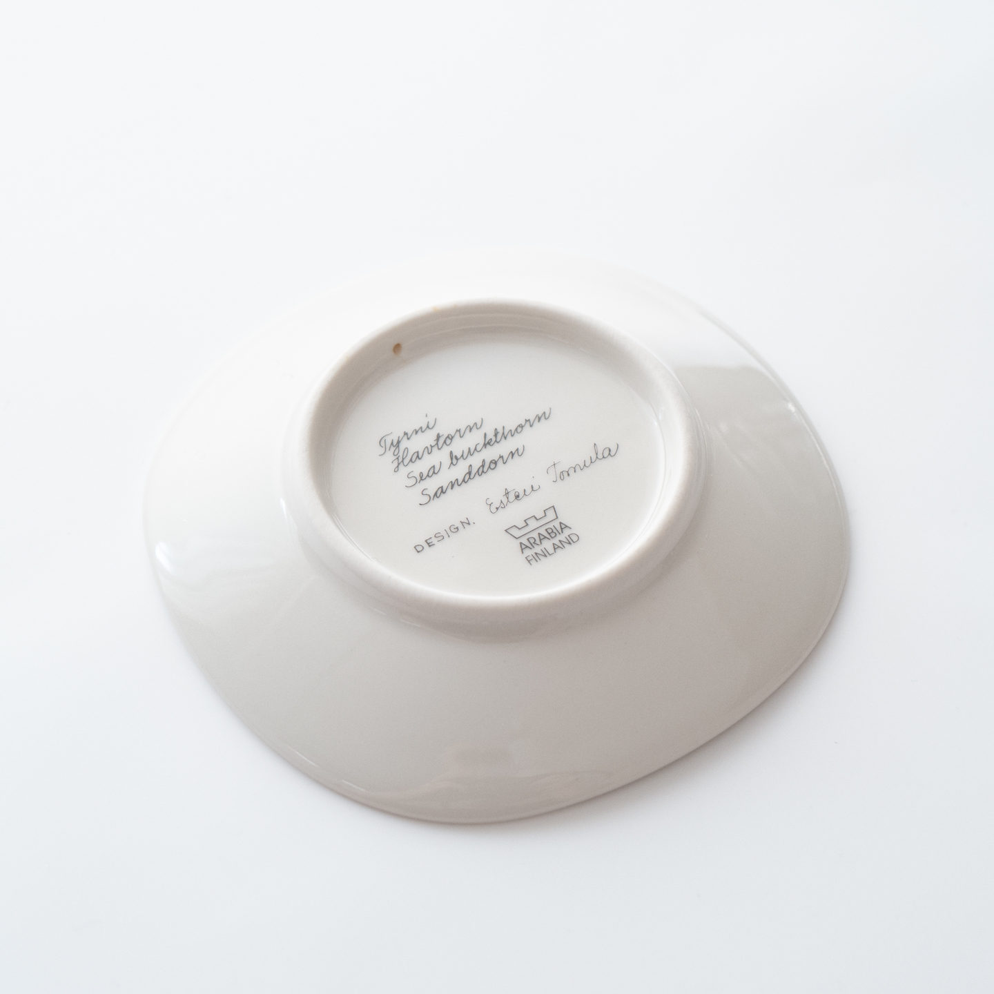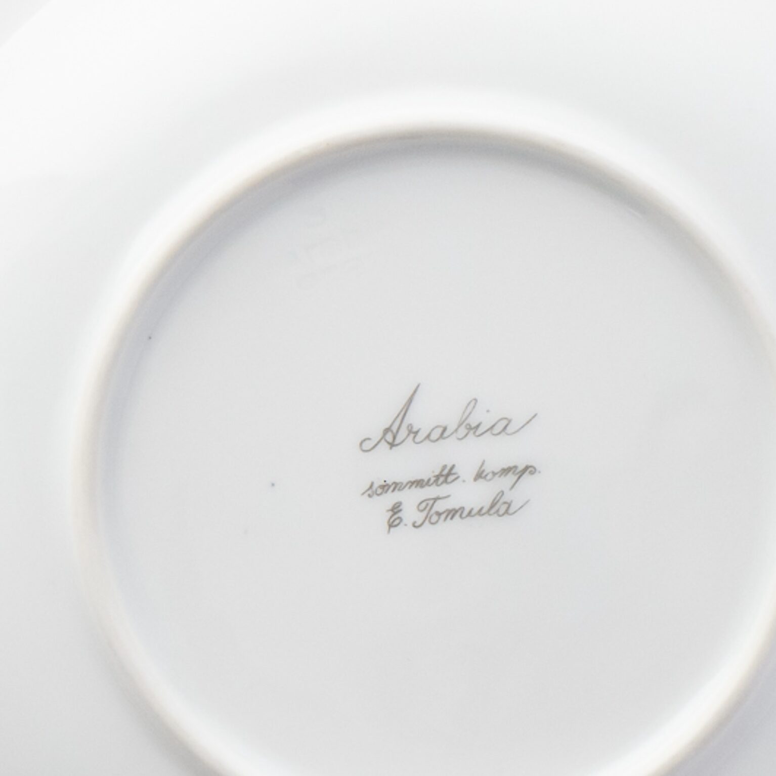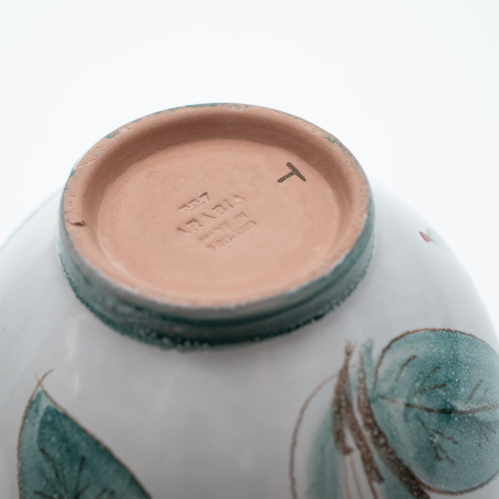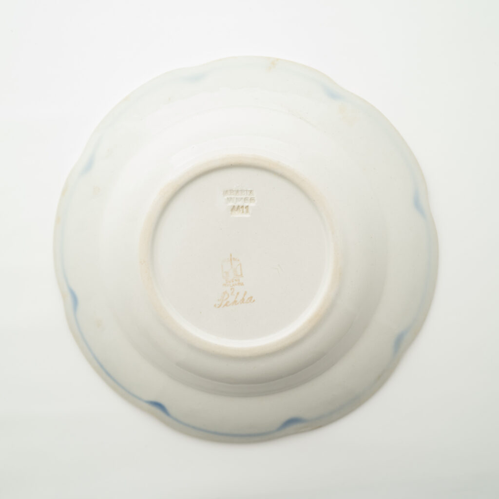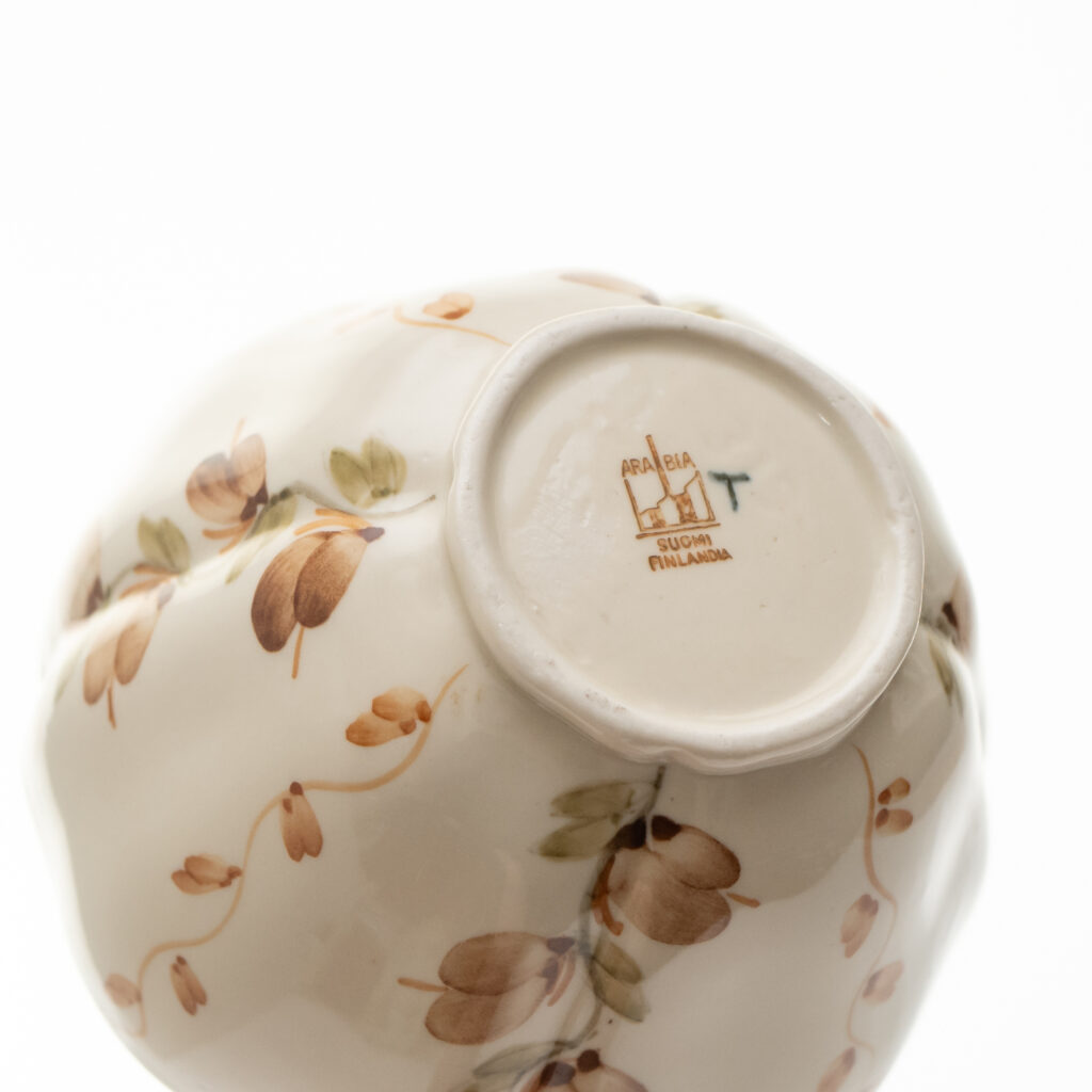 こちらのMonicaシリーズには、通常とは異なる筆記体デザインのスタンプが残されています。上には「Arabia」と、真ん中には「Somm. Komp. (それぞれ、フィンランド語とスウェーデン語でパターンデザインの意味)」と、下には「E. Tomula」と。