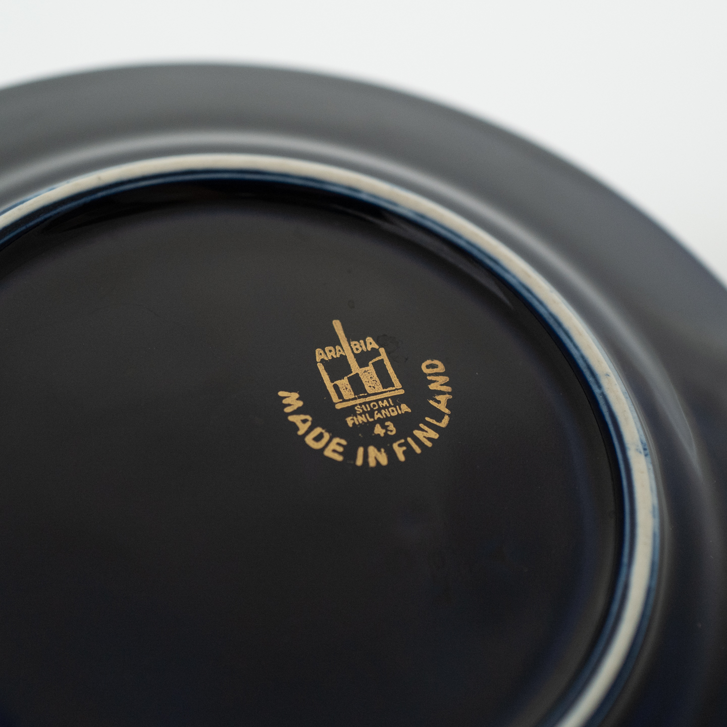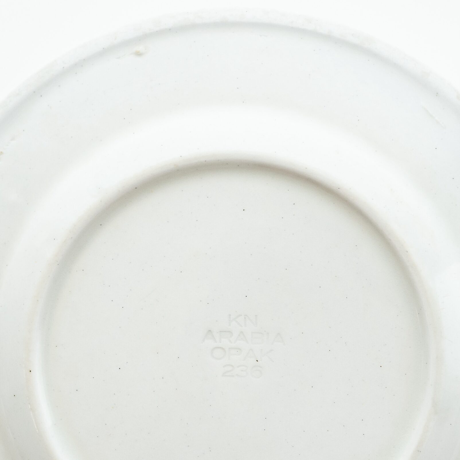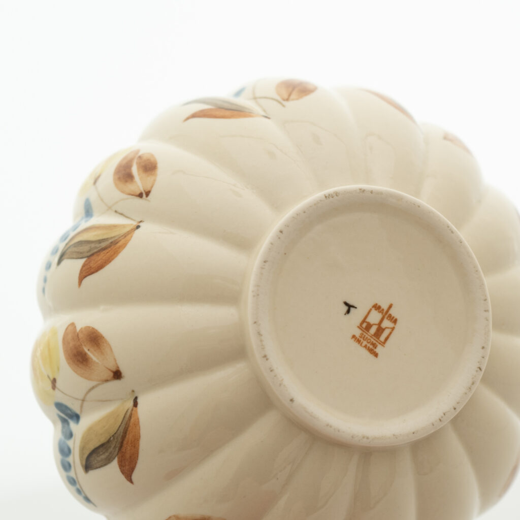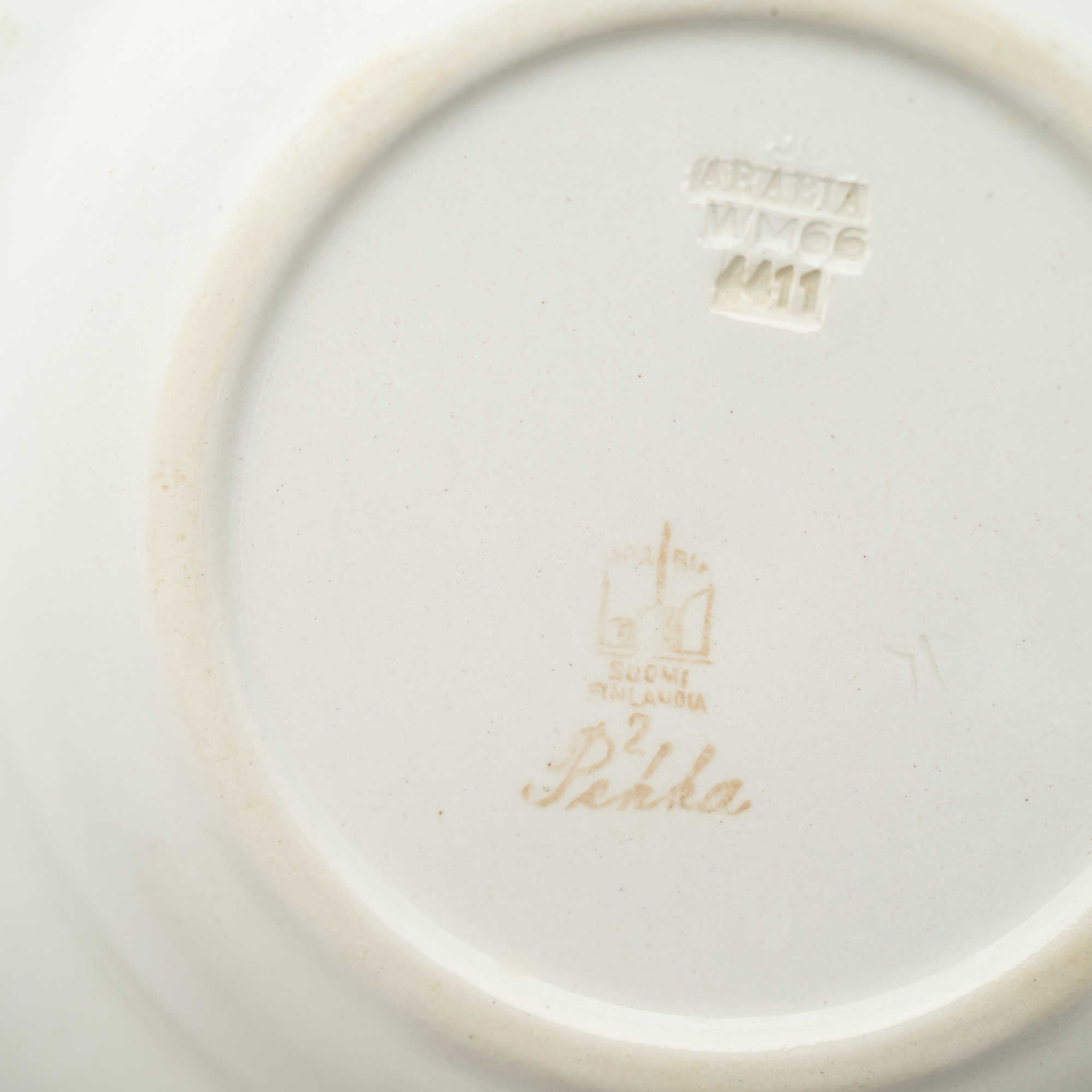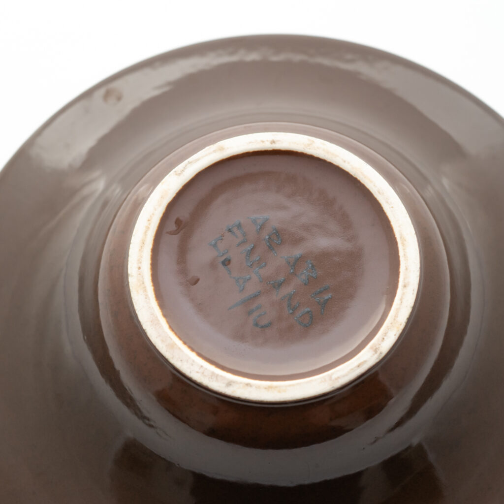 こちらのMonicaシリーズには、通常とは異なる筆記体デザインのスタンプが残されています。上には「Arabia」と、真ん中には「Somm. Komp. (それぞれ、フィンランド語とスウェーデン語でパターンデザインの意味)」と、下には「E. Tomula」と。