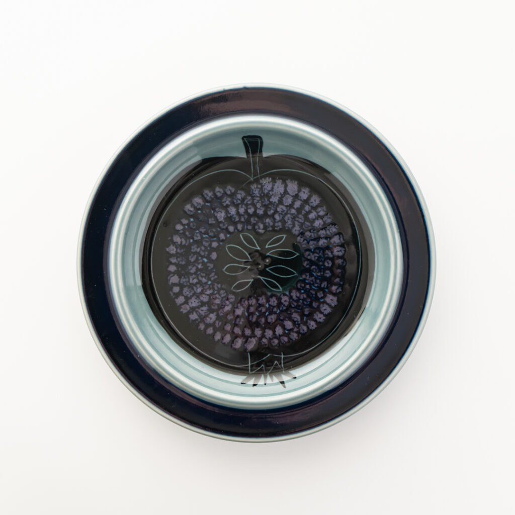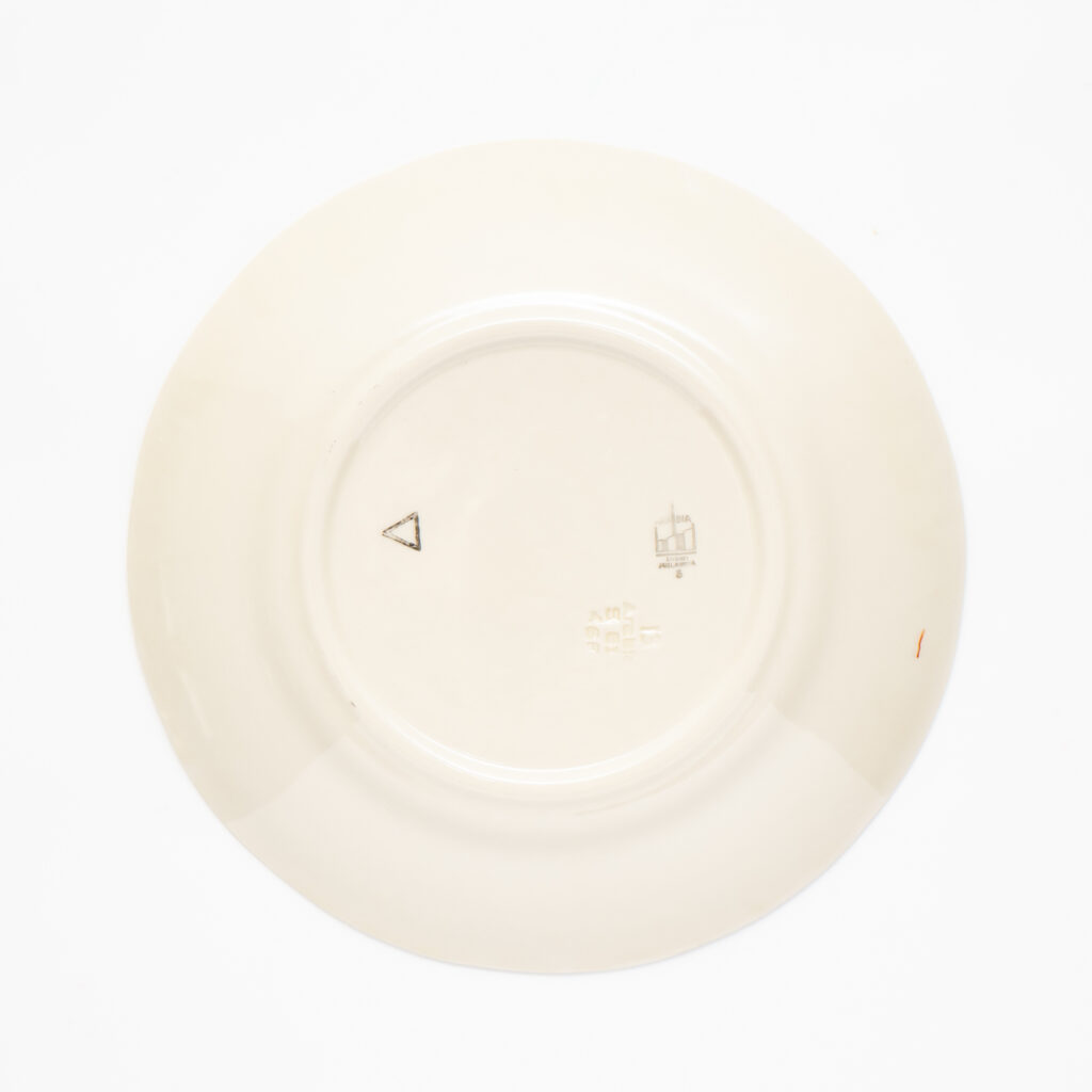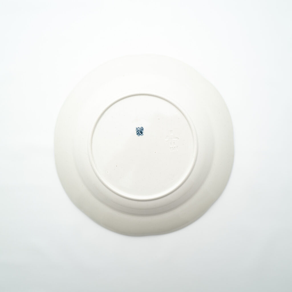 こちらはFructusシリーズのプレート。同様に、デザイナーと絵付師のイニシャルが書かれています。ハンドペイントで装飾されるデザインは、絵柄が同じでも、担当した絵付師によって雰囲気が異なることもよくあります。