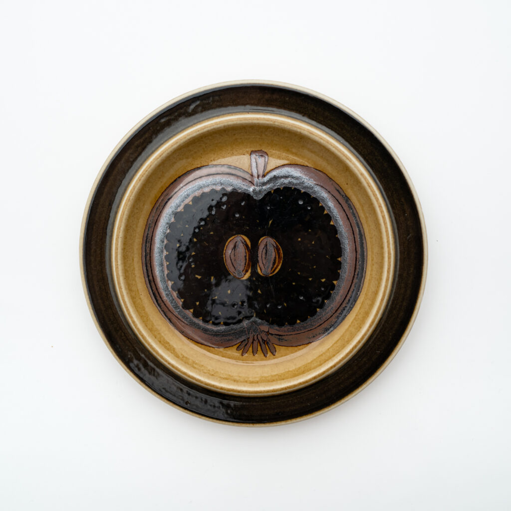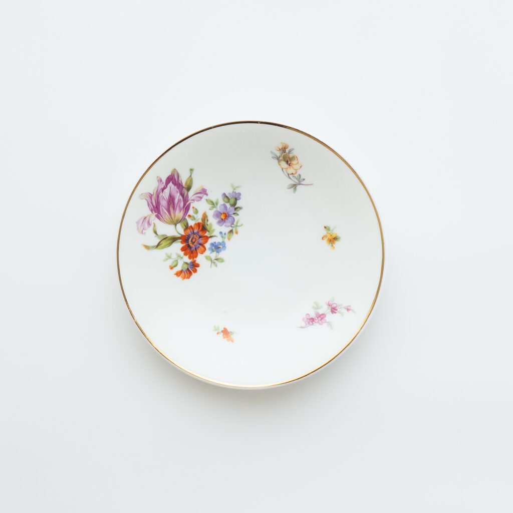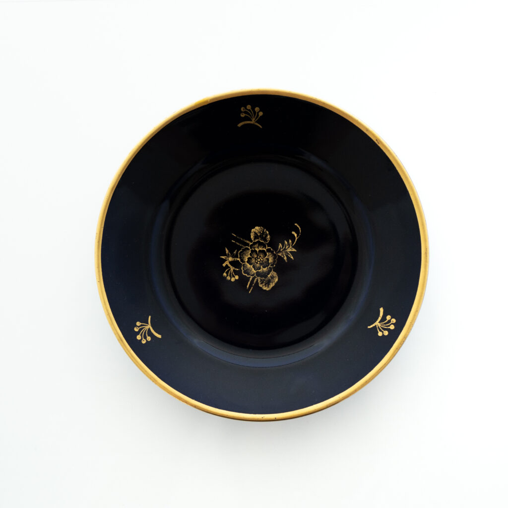 こちらはFructusシリーズのプレート。同様に、デザイナーと絵付師のイニシャルが書かれています。ハンドペイントで装飾されるデザインは、絵柄が同じでも、担当した絵付師によって雰囲気が異なることもよくあります。