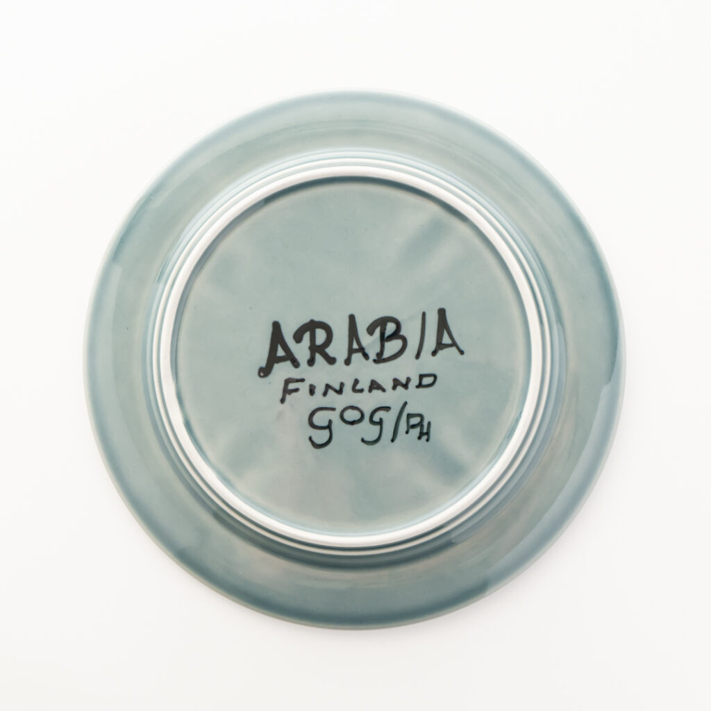 「モノ」の著作者をデザイナーとするのか、実際の製作者(たとえば絵付師)とするのか、あるいはそのどちらもか。ARABIAにおいてもその解釈は時代によってさまざまで、デザイナーの名前を裏面に記したり、絵付師の名前を記したり、あるいは誰の名前も残さないようにルールを設けたり。それぞれの時代の考え方の違いが、器の裏側に現れています。