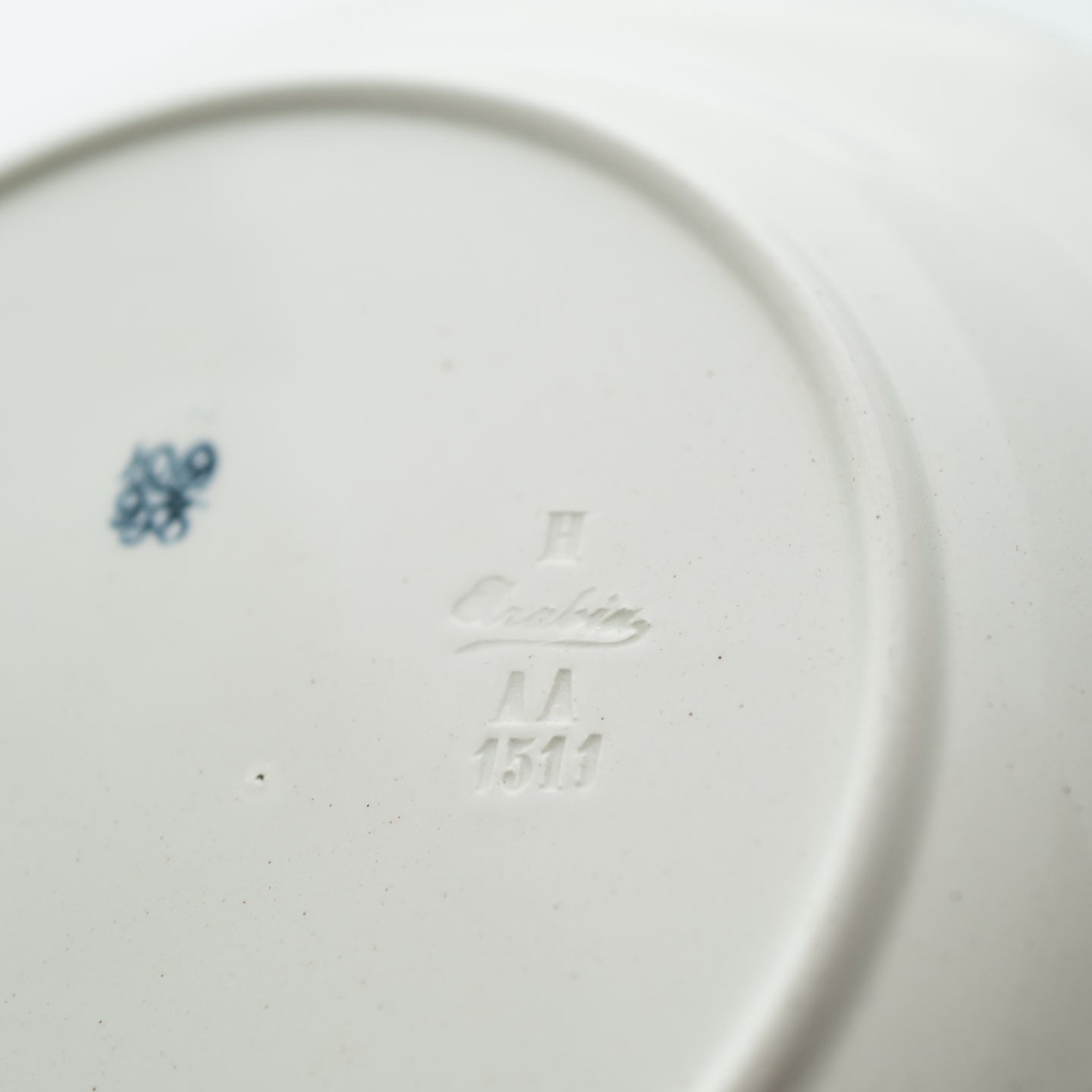 ハンドペイントによって装飾されたデザインには、 デザイナーと絵付師の名前が共に記されることもあります。左側のHLAがデザイナーのイニシャル、IUが絵付師のイニシャルです。