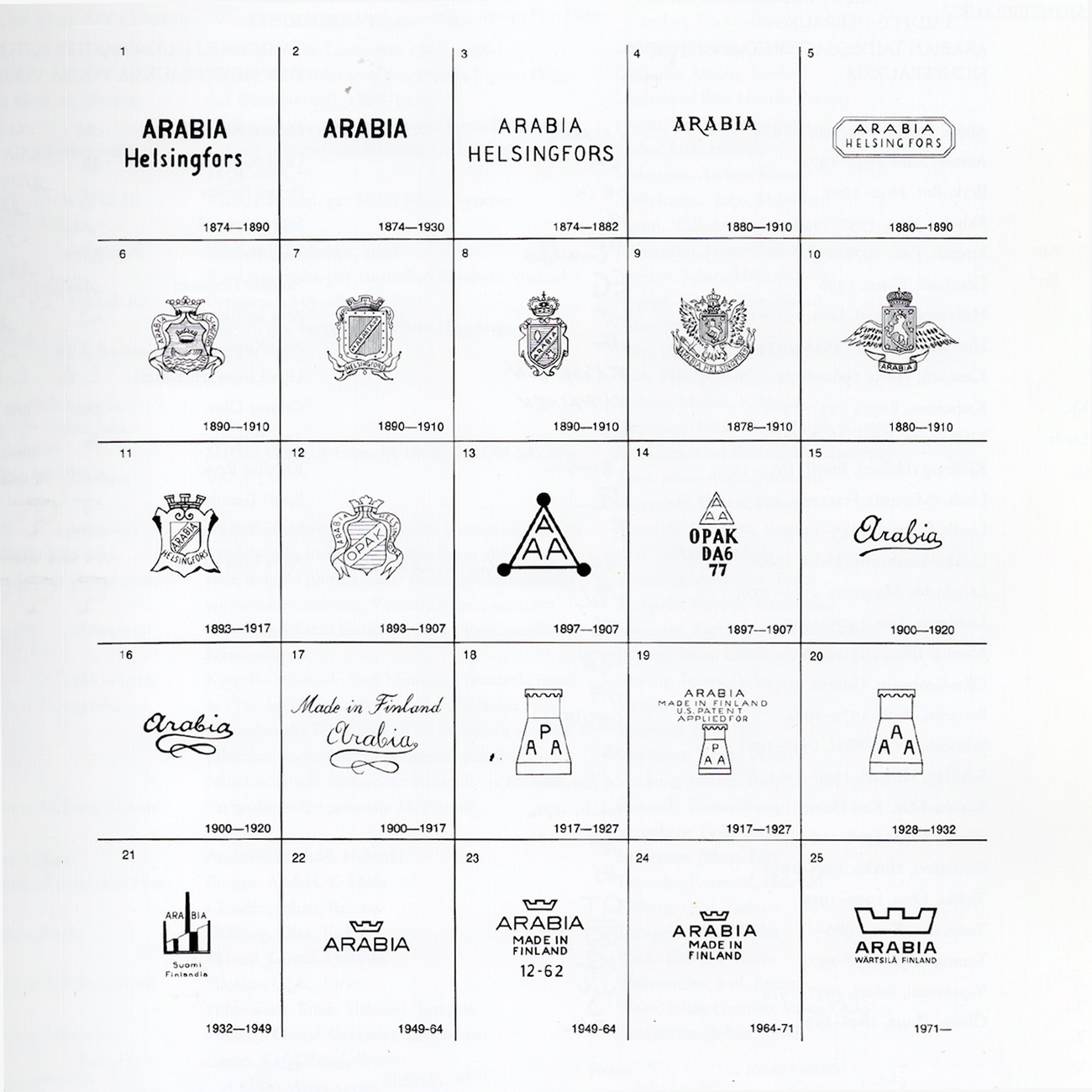 ARABIAで生まれた数多もの器たち。150年という時間の経過を考えると、その膨大さを容易に想像することができますが、実は、その多くは裏面に残されたスタンプによっておおよその製造年代を特定することができます。上の表にあるように、ARABIAの器には年代ごとに異なるデザインのスタンプが押されているのです。