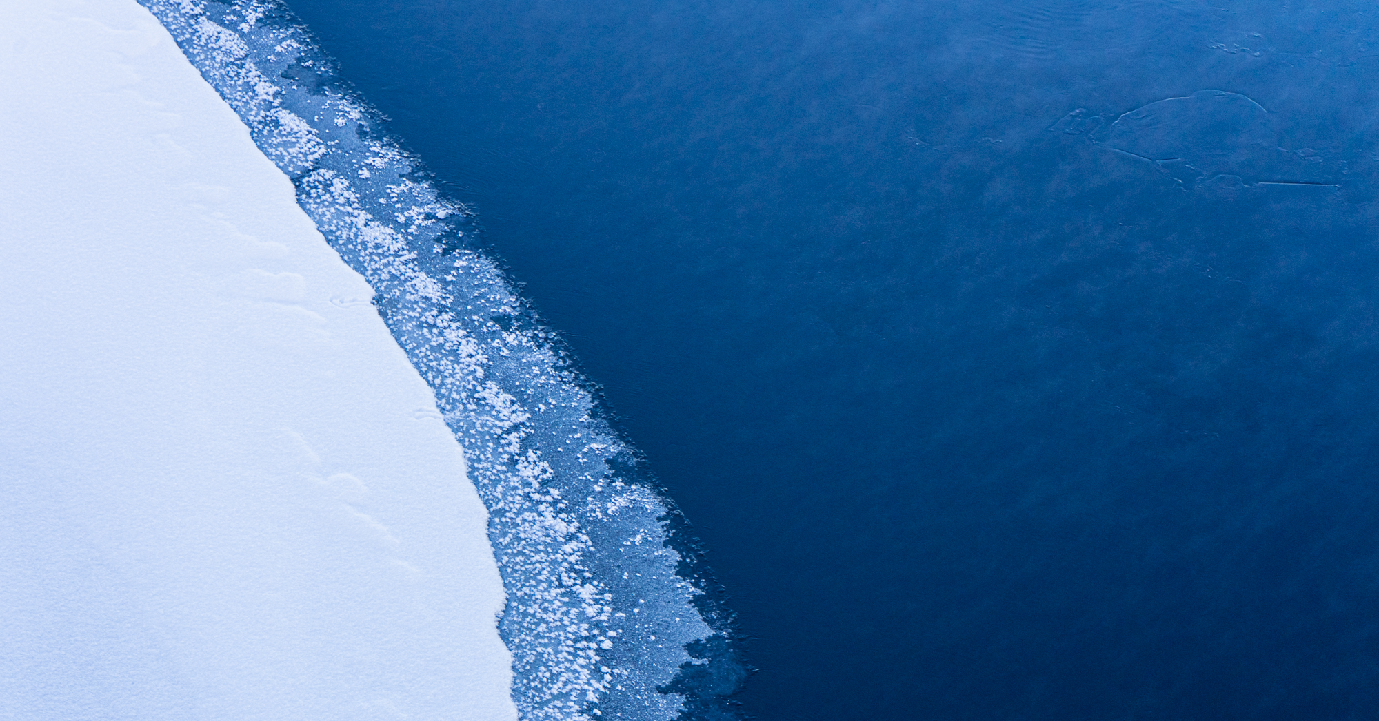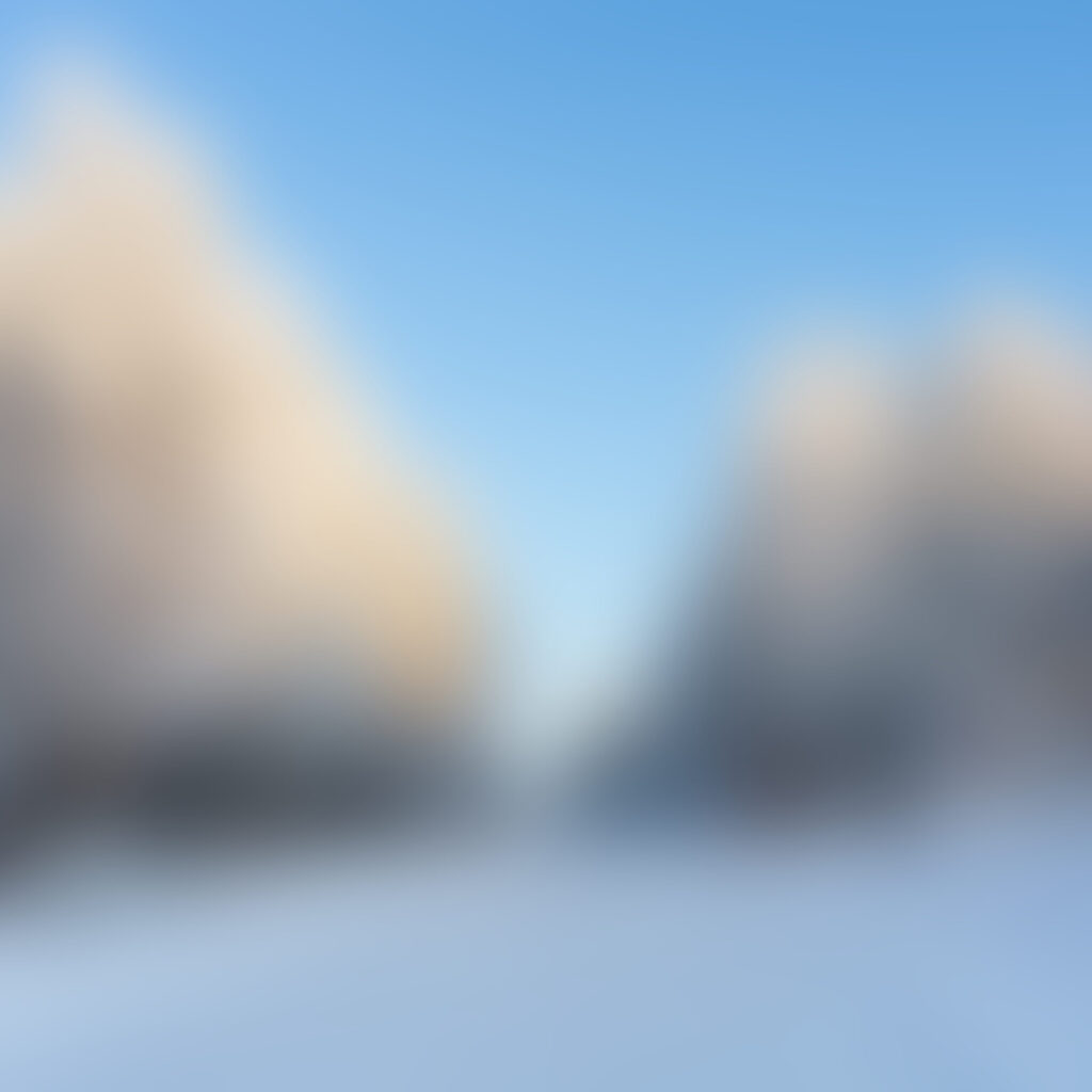空の青と雪の白、斜めに深く差し込む光のオレンジ。