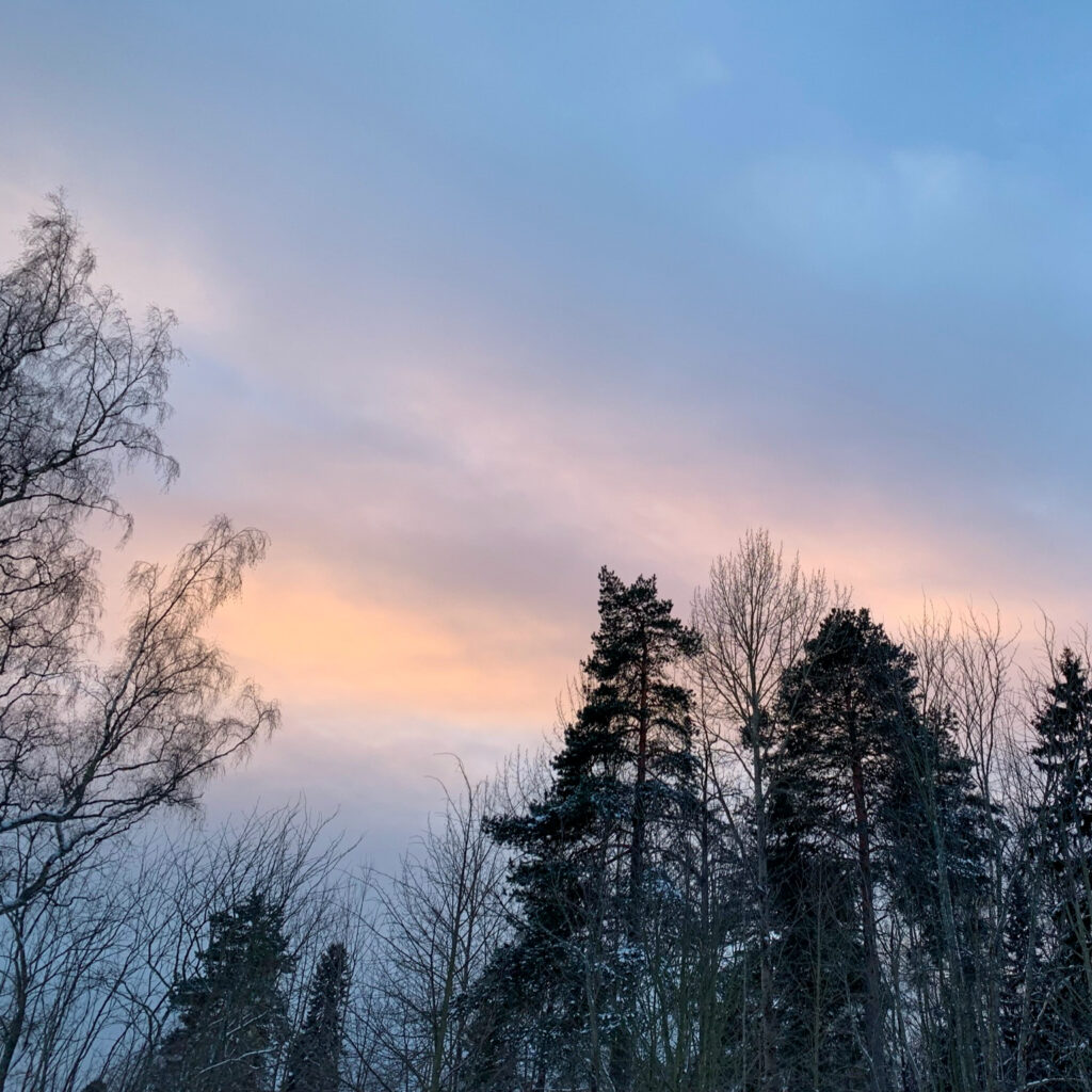優しいブルーとピンクのグラデーション。日本に戻った今でも記憶に残り続けているフィンランドの風景のひとつです。西の空が夕焼け色に染まるころ、反対側の東の空が淡いピンク色に染まることがあります。この帯はビーナスベルトと呼ばれるそうで、上側の昼の青と下側の夜の青(地球の影)に挟まれた、まさに昼と夜の境界線です。空の風景はいつも抽象的でぼんやりとしているので、いつまでもぼーっと見ていられます。