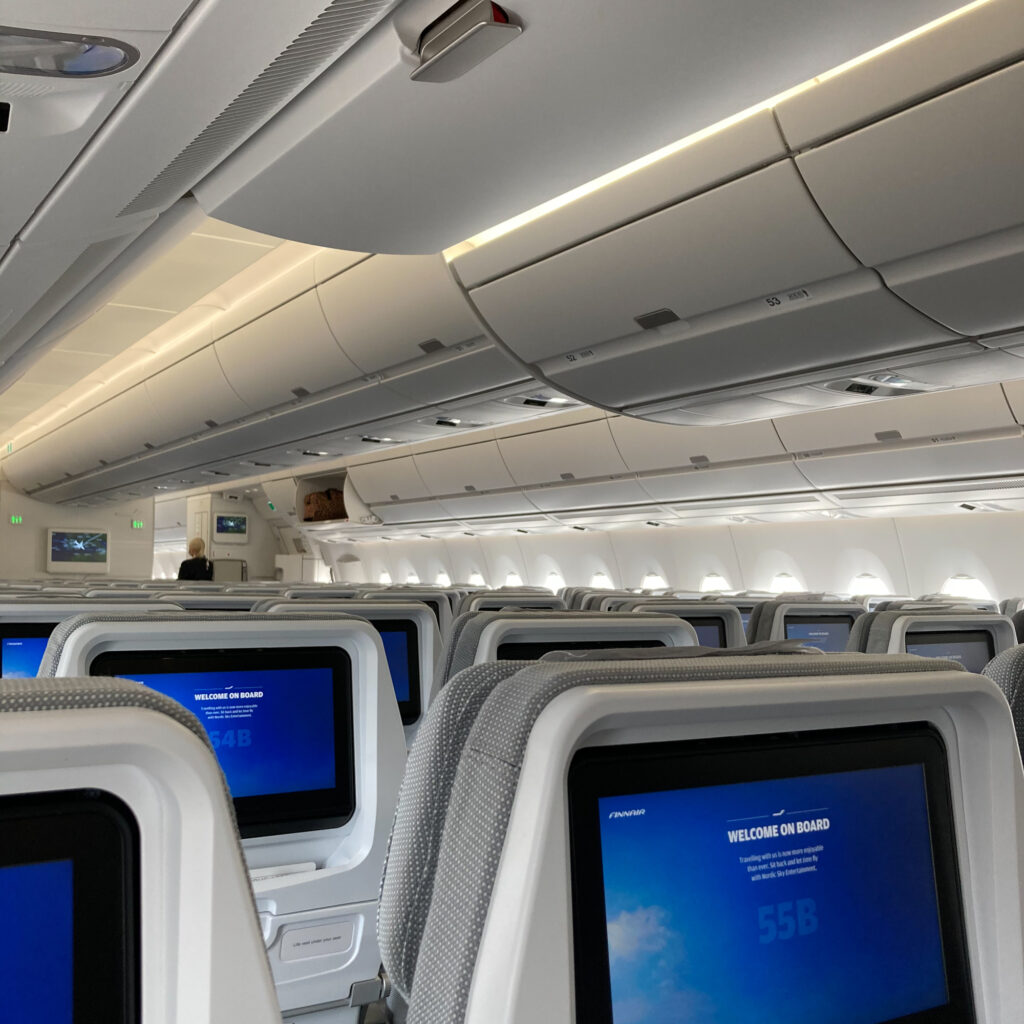 フィンランドへの旅の始まりはいつも、ここから。玄関口はもちろんヘルシンキ空港ですが、フィンエアーの機内では一足早くフィンランドが感じられます。白、青、シンプルに。限られた色彩と要素がすっきりとまとめられているこの空気感は、まさにこの国のシンボルとも言えるものではないでしょうか。眼下に広がる雲と空の風景は、まるでフィンランドの雪景色のようです。