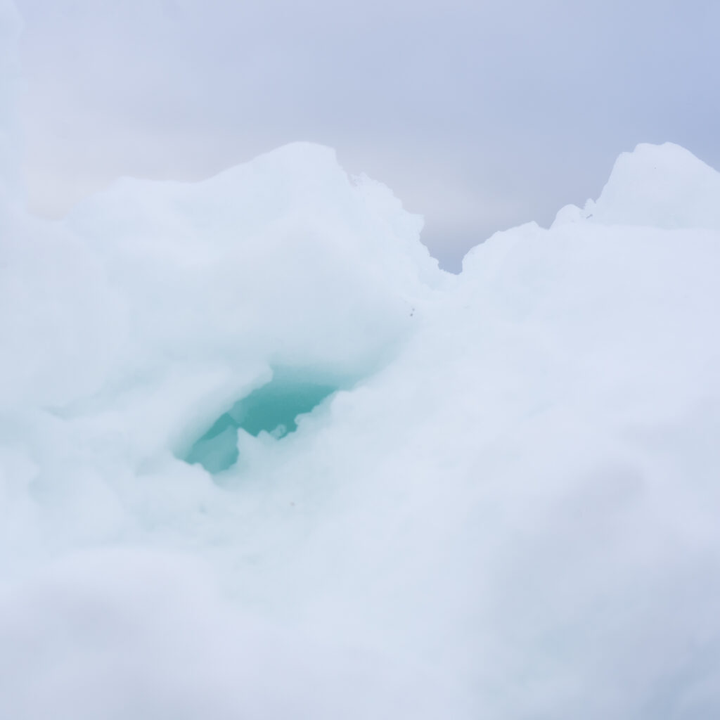 透明なイメージがある水も、状態が変われば目に映る色も異なります。雪の表面は光が乱反射して真っ白に。しかし、窪みの部分では少しの光が透過して青っぽい色が感じられます。海が青いのと基本的には同じ原理で、波長の短い青色が水の分子に吸収されにくいためです。