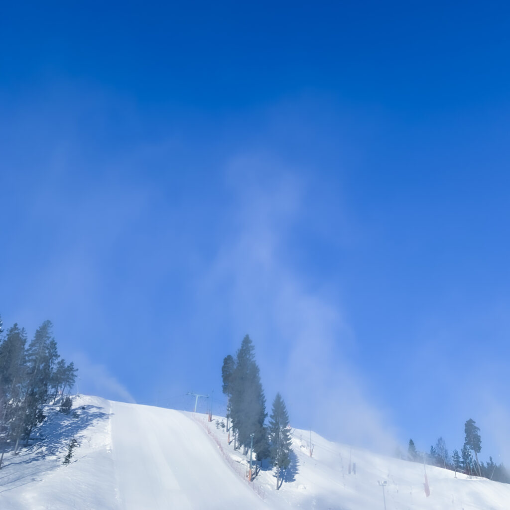 スキー場では雪が青い空に向かって高く舞い散り、白から青への繊細なグラデーションは空気の動きを可視化します。