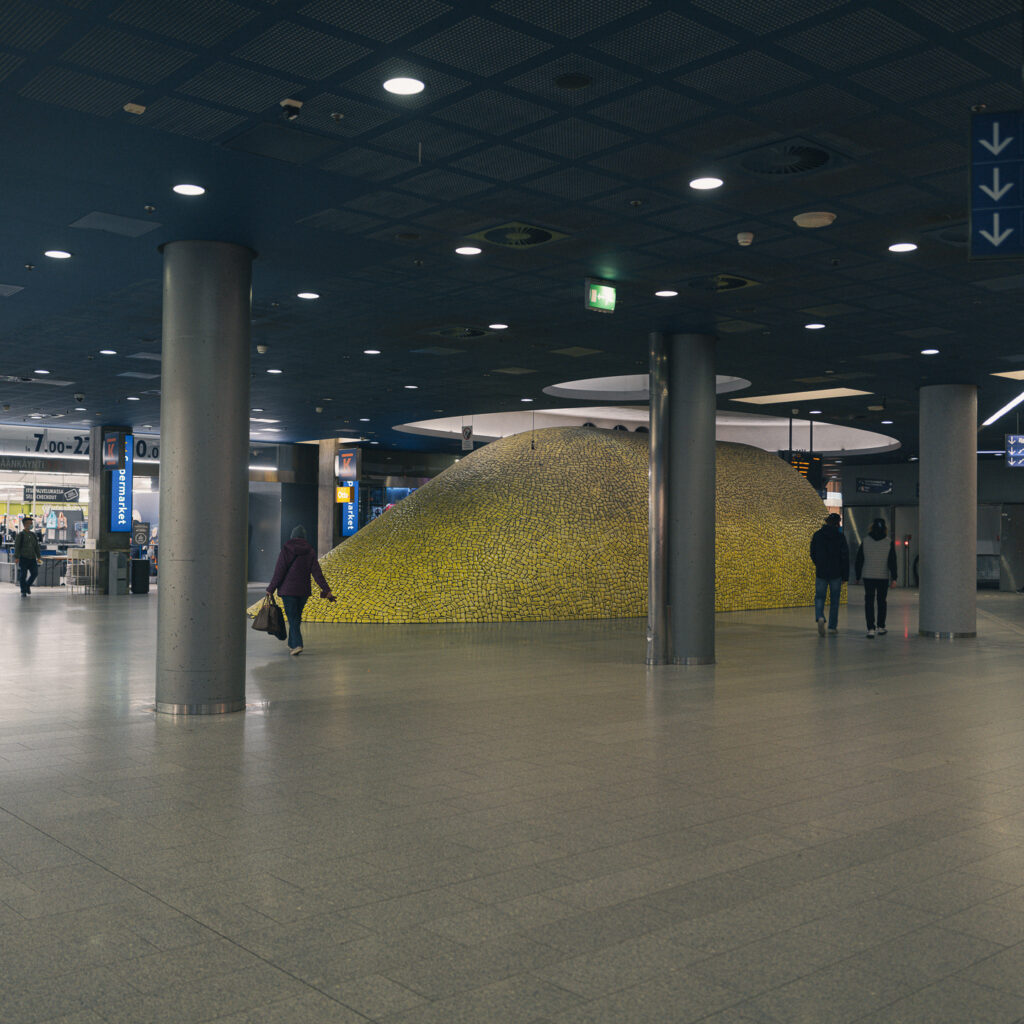カンピのショッピングモールを歩いていると、自然と目に入ってくるのがこの黄色い謎のオブジェ。実はこれが異世界への扉、つまり地下の駅へのエントランスです。