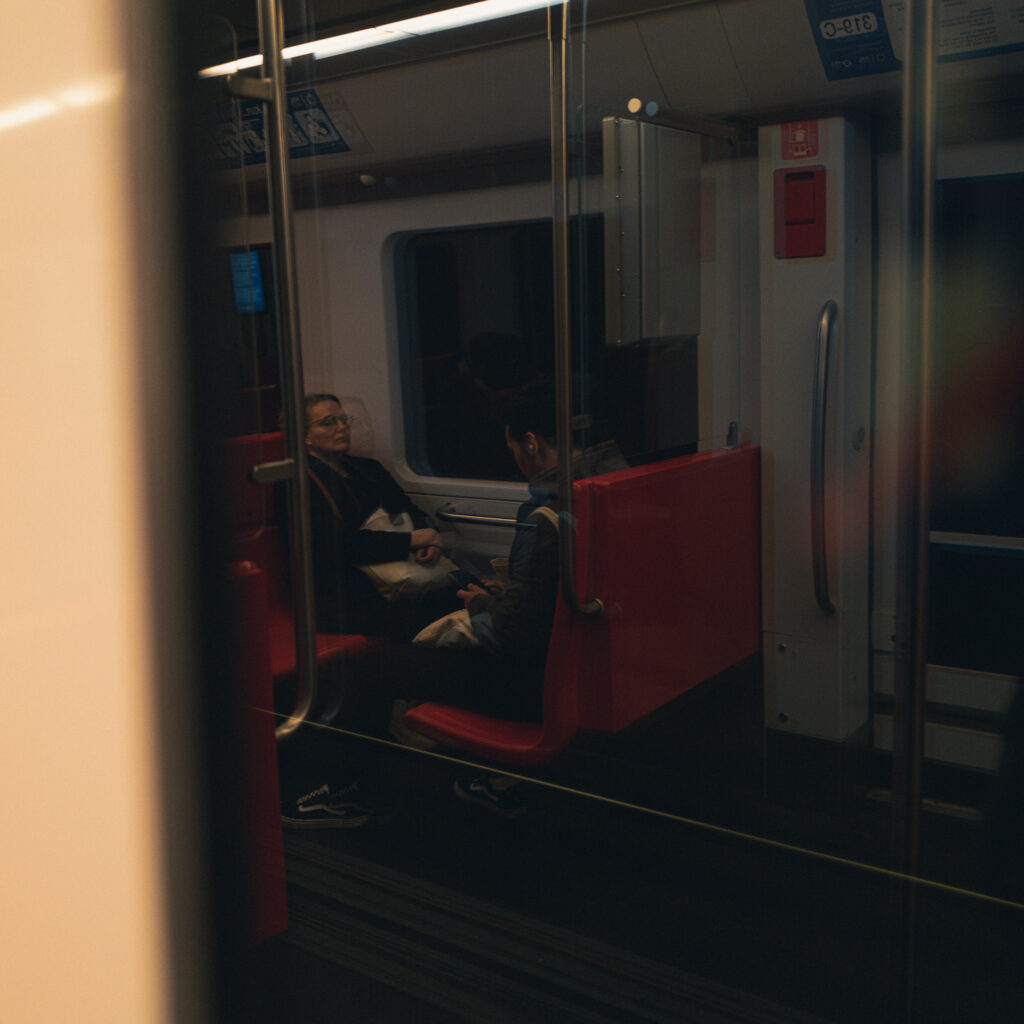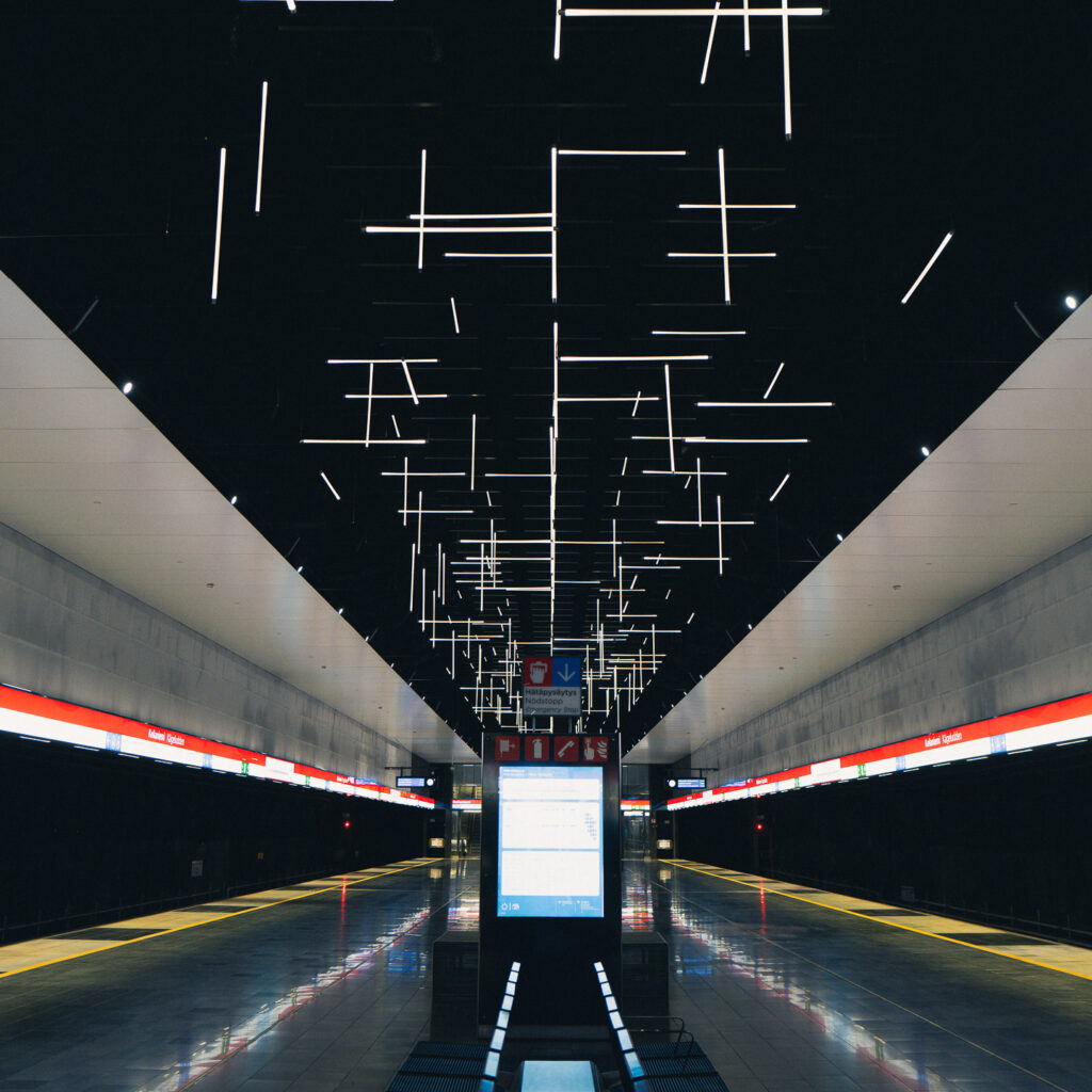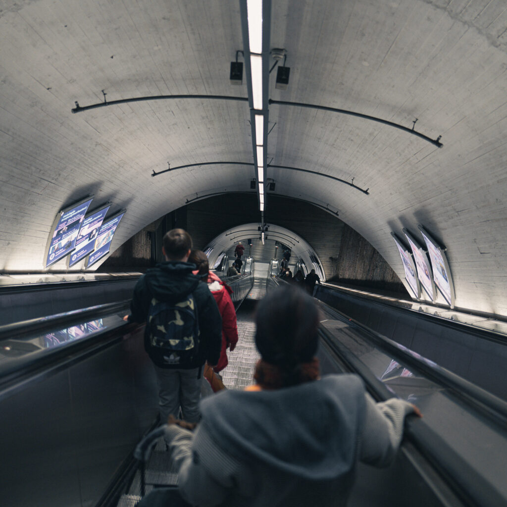 足を踏み入れると、はるか下までつづく長いながいエスカレーター。周期的に横を通り過ぎる広告と均質な壁、均質な光。さながら高速道路のトンネルを車で颯爽と走っているかのような気分になります。