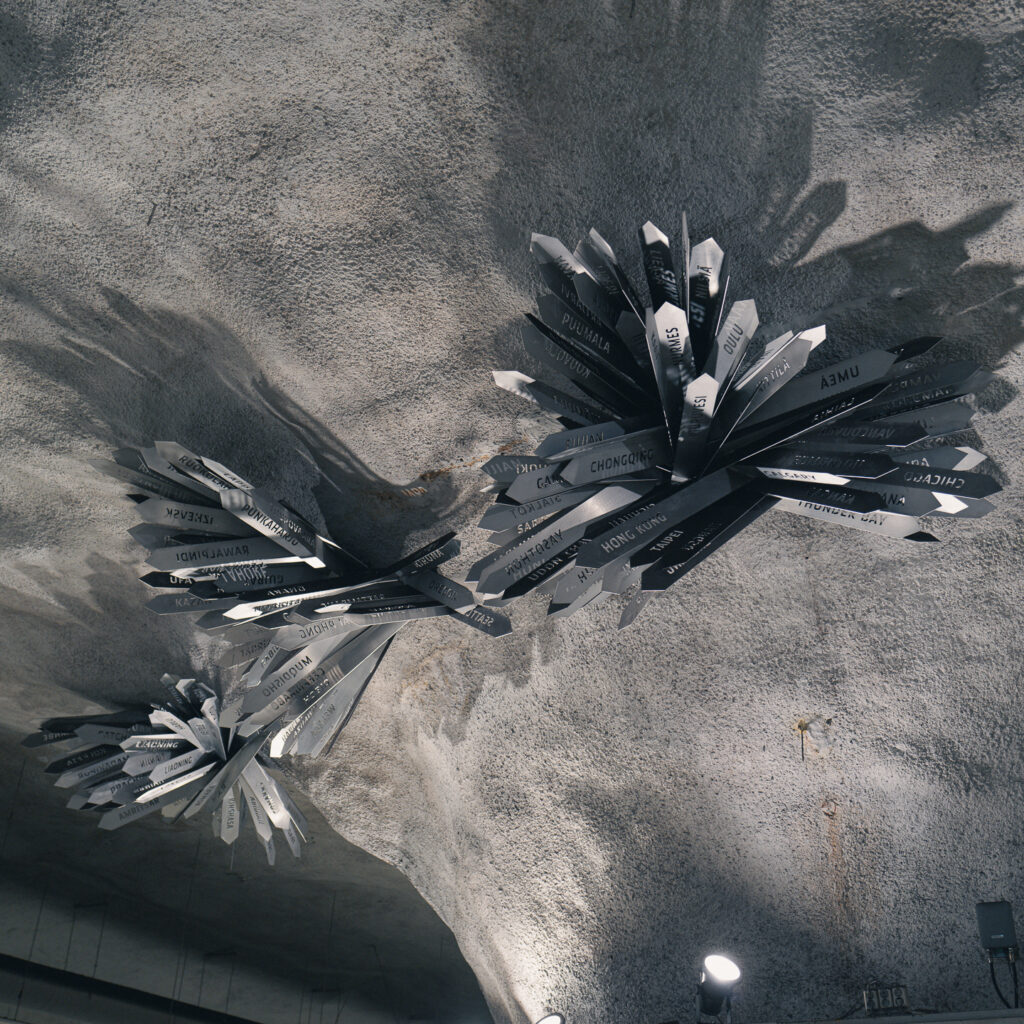 トンネルを抜けると、世界中の都市の方角を示した銀色のオブジェが目に入ります。はるか彼方の東京へ、想像を巡らせながら。