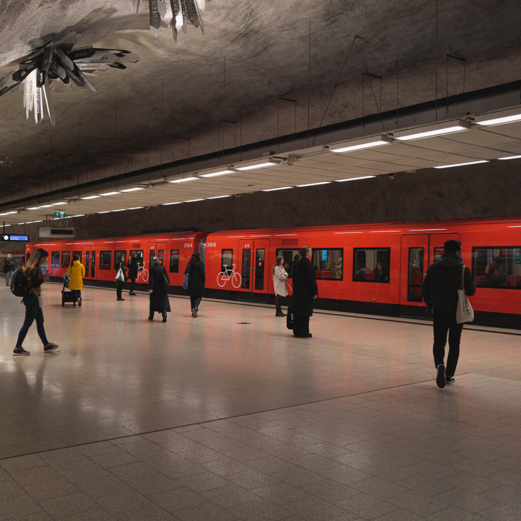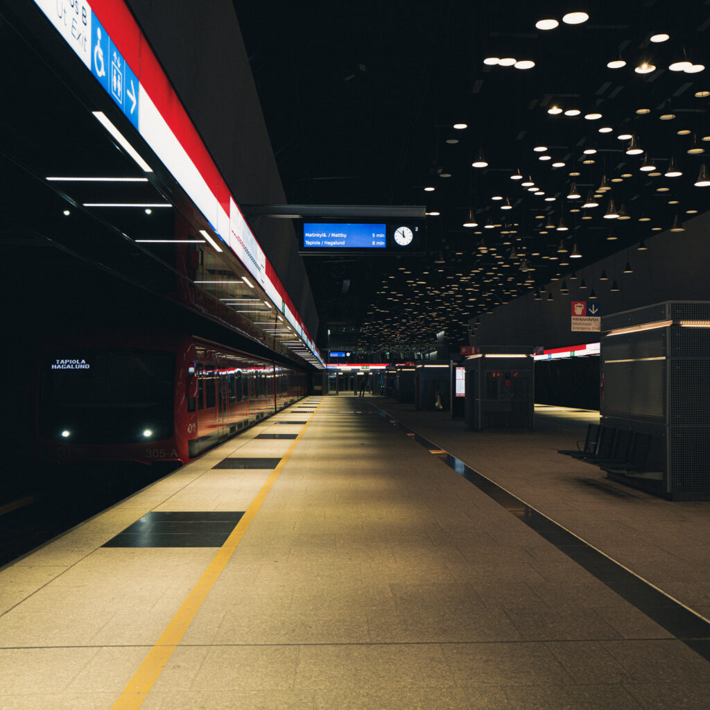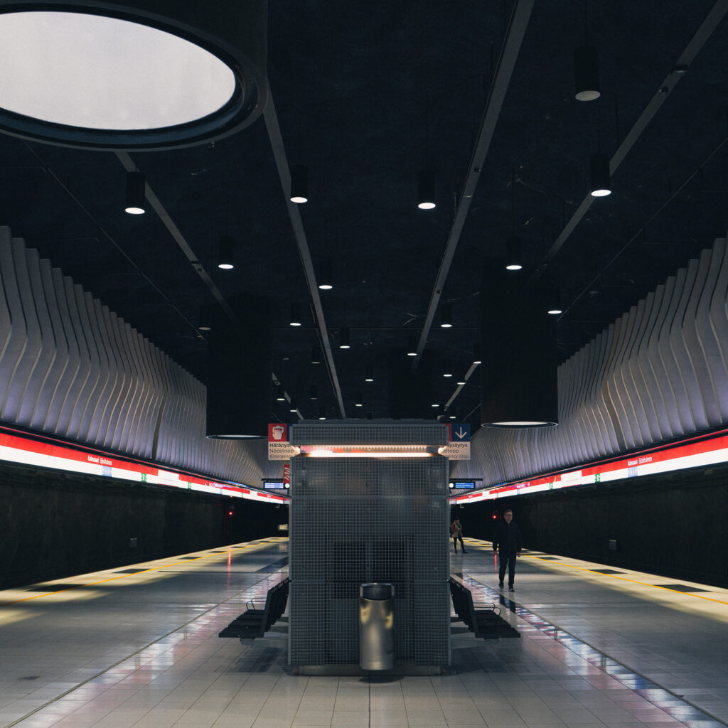 ヘルシンキの東西方向に走るこの地下鉄は、1982年の完成以来、着々と延長工事が続けられていて、今日に至るまでちょっとずつ西へ東へとその範囲を拡大してきました。地下深くにつくられる駅にはもちろん太陽光は入ってきません。そのため、駅の空間は「光」に対してとても慎重に設計がされており、どの季節でも心地よい空間が広がっています。