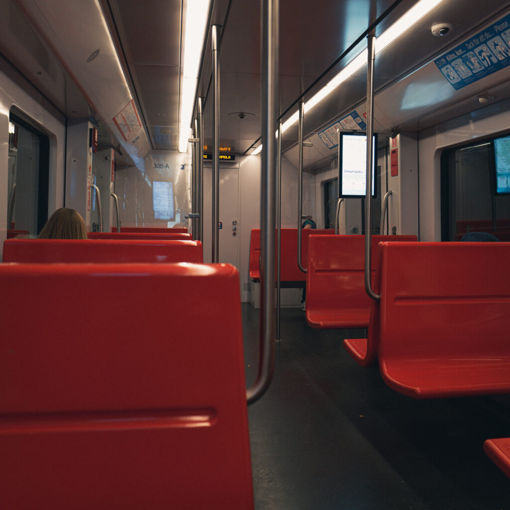 オレンジ色の車両のデザインは、フィネル / FINELのかわいらしいポットなどで知られるアンティ・ヌルメスニエミ。どうしてオレンジなのだろうと考えたことは一度だけではありませんが、毎日のように使っているとなんとなくその理由も、魅力も、わかるような気がしました。ぶら下がったオレンジのベンチに腰をかけていると、ちょっとだけ気分が軽くなるような、ならないような。けど、そのくらいの小さな感情のゆらめきさえも、通勤や通学をする人たちにとっては大きな救いなのかも知れません。