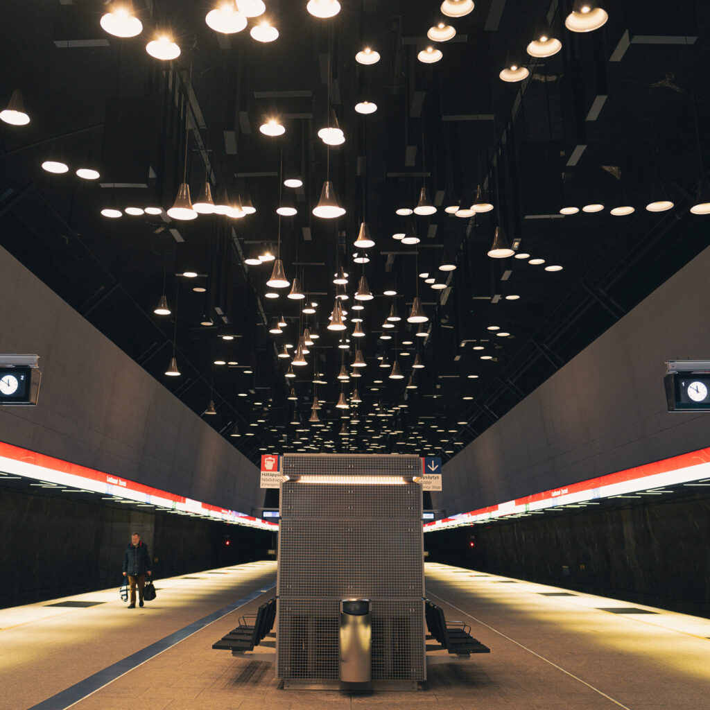 と言うのも、2017年以降にできたいくつかの駅にはデザインのテーマがその土地にちなんで設定されており、海に浮かぶラウッタ島のこの駅のテーマは「水」なのです。水面のようにゆらゆらとしながら輝くペンダントライト。とても美しくて、つい視線は上へと向かいます。
