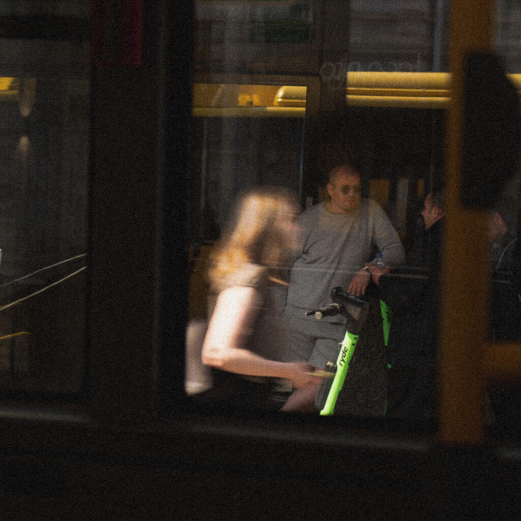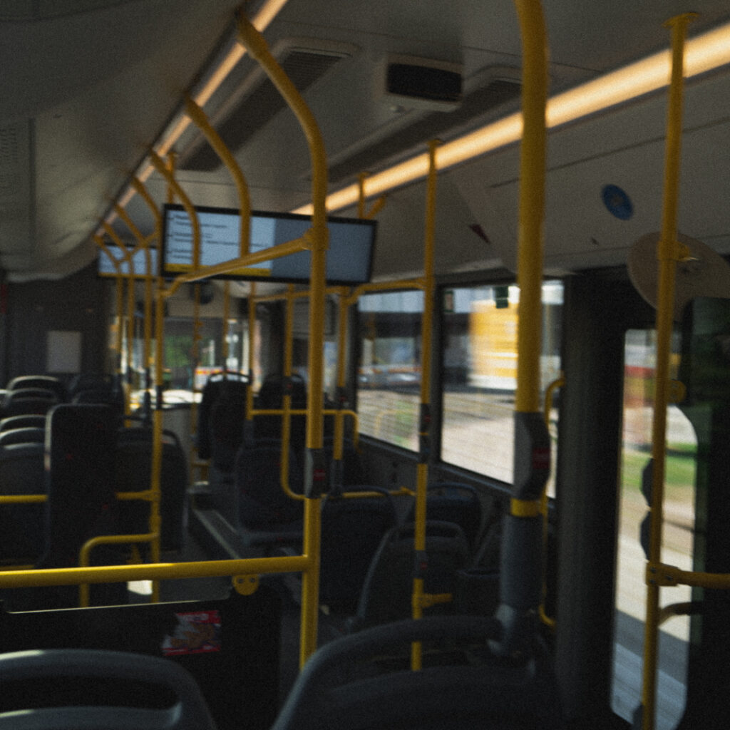 バスのなか。手すりの色が違うだけで、いつもと少し違った心地がします。そういう小さな心のゆらめきが、知らない街に来たというワクワク感(あるいはドキドキ感)を生み出しているのでしょう。窓からの街の風景も新鮮に映ります。