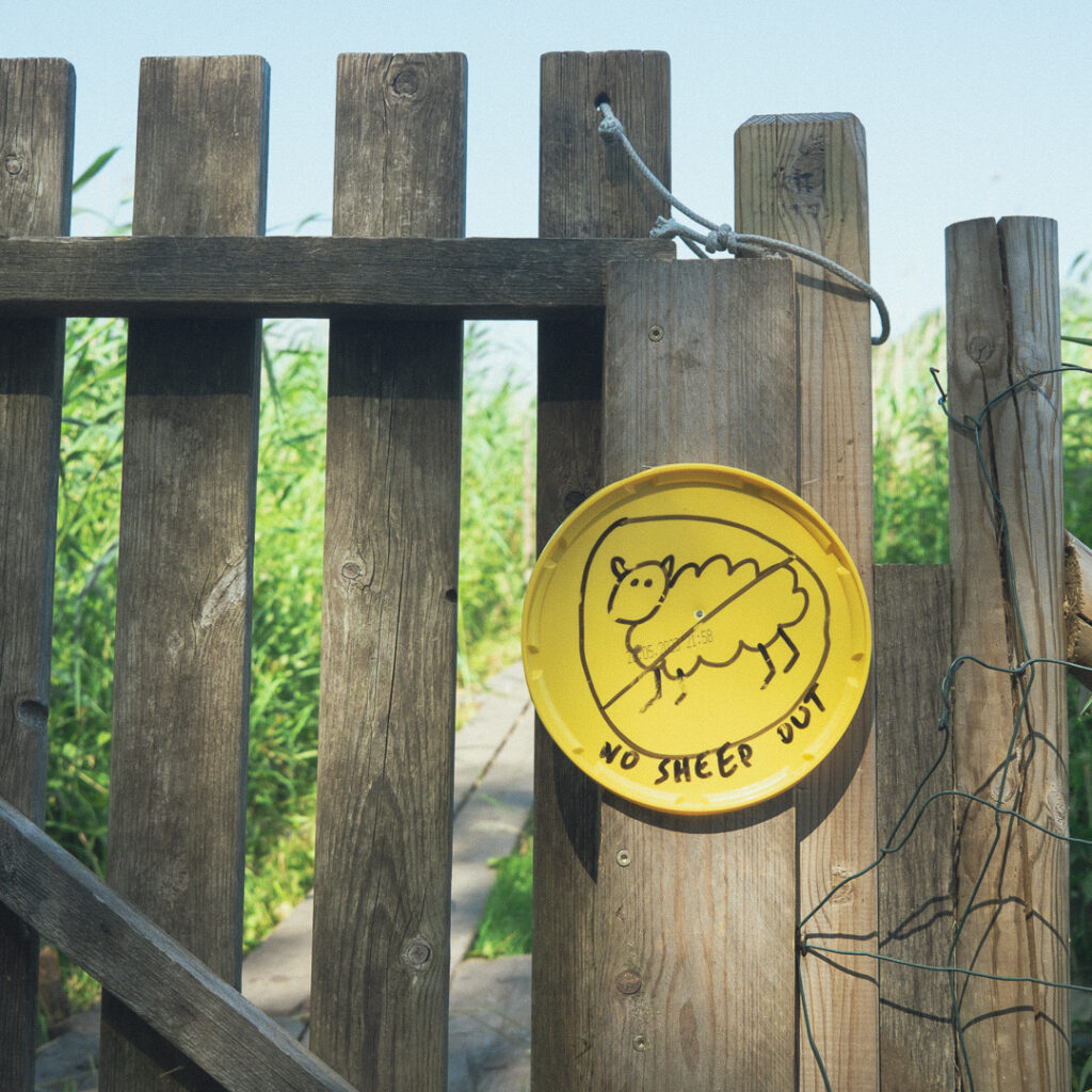 この黄色い看板は人に向けたものなのか、あるいは羊に向けた切なる願望か。真相はさておき、手書きの文字とイラストからは様々な想像が膨らみます。